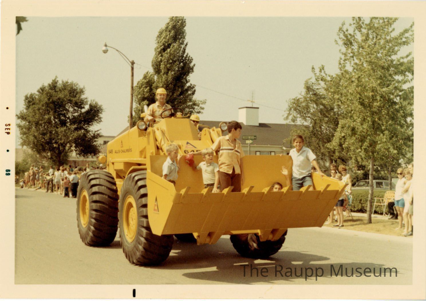 One (1) color photograph of a construction vehicle carrying 5 children in the scoop in front, down the street during the Buffalo Grove Days Parade. The man driving has a yellow hardhat and t-shirt on, with 4 young boys standing in the vehicle front, and one boy sitting. There are people standing behind, on the street side watching the parade. The street sign shows they just passed Rosewood.