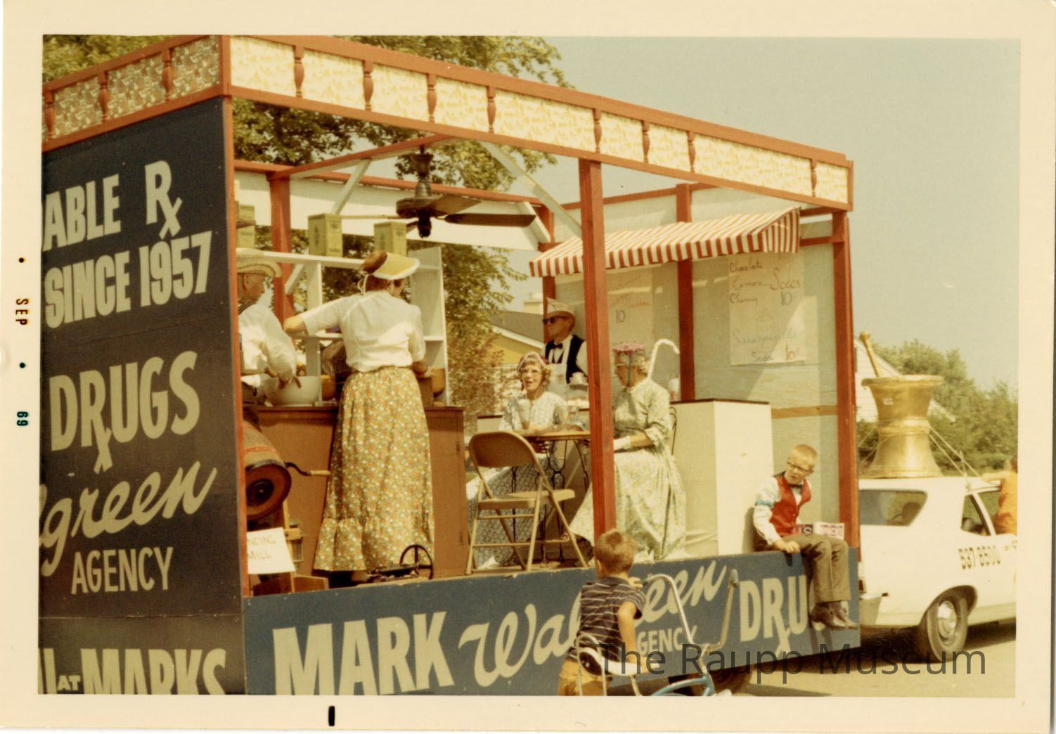 One (1) color photograph of the Walgreens float in the Buffalo Grove Days Parade, 1969. The float creates an old Walgreens store, with 6 peoples inside (3 adult women, 2 adult men, a young boy). There is a counter with old drug boxes and a milkshake counter.Made/Created