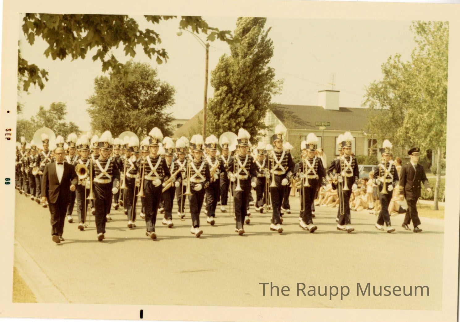 One (1) color (sepia toned) photograph of the marching band at the Buffalo Grove Days parade, c. 1969. There are eight rows of uniformed young men and women, marching in black outfits with white "x" and lines across the front. They have on black hats with white feathers on top. The row in front are trombone players, with tubas and other instruments present throughout. There is a house in the background right.Made/Created