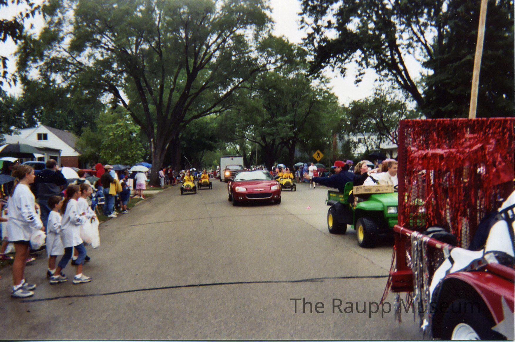 Color photographic print. Image of the Buffalo Grove Days parade. Red car traveling down road. Woman and man driving in green vehicle. Red streamers on float on right. Four children in white shirts on left. Background people in umbrellas and people in yellow go-karts. Image printed on DuraLife paper. reverse side marks: "Kodak perfect touch processing Oct/9/03 ID658350 <24A> EGK1