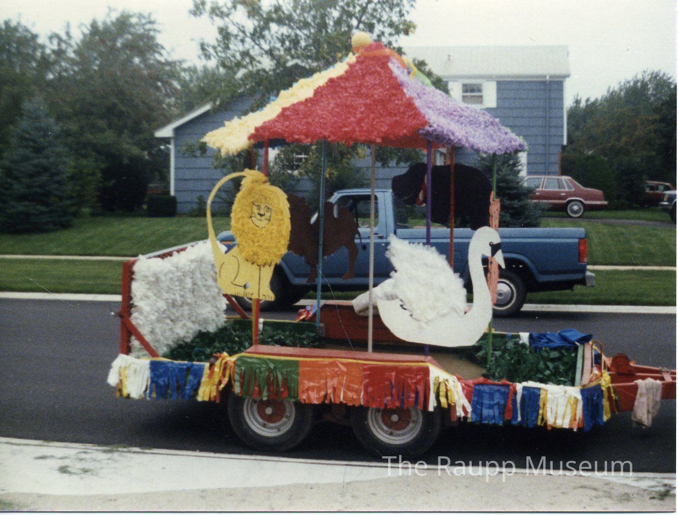 Color photographic print. Image of Buffalo Grove Days parade float. The float is mounted to a pull trailer. Its base has hanging multicolored tassels and a carousel with a lion, a swan, a camel, and one other unidentifiable pink animal glued to various poles holding up a small tent.Dimensions