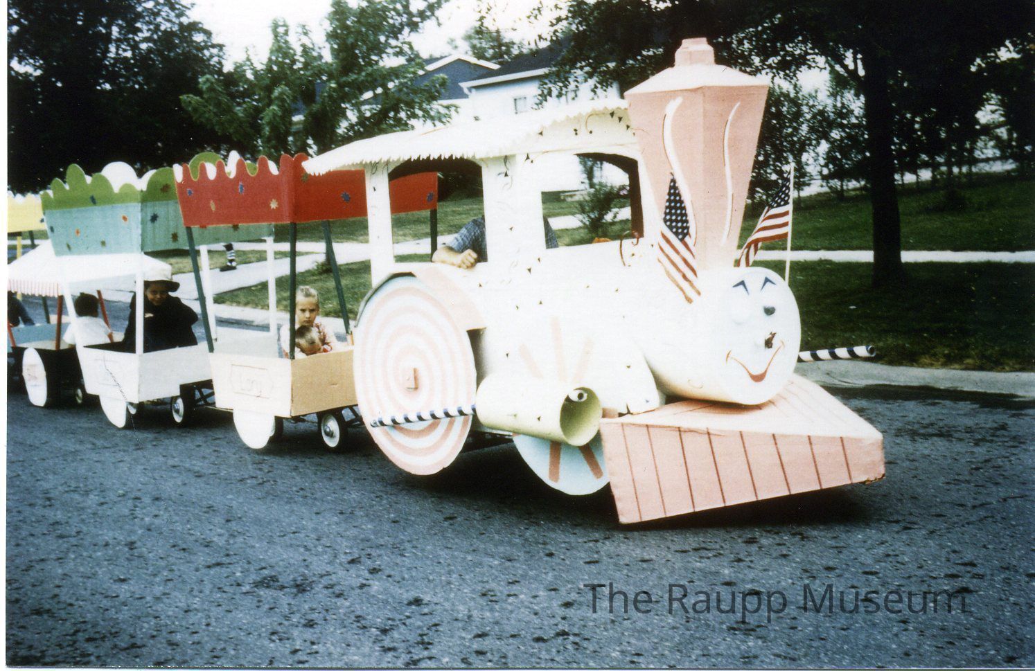 Color photographic print. Image of the Buffalo Grove Days parade. Image of a white and pink train float pulling colorful carts behind it. The carts have four children sitting inside. The front of the train has a bunny face painted on the engine. Partial view of a man wearing a blue shirt seated in the front car. Image printed on Fujifilm Pictro paper. reverse side text written in black ink: "1964; 1st Place; BG Days."