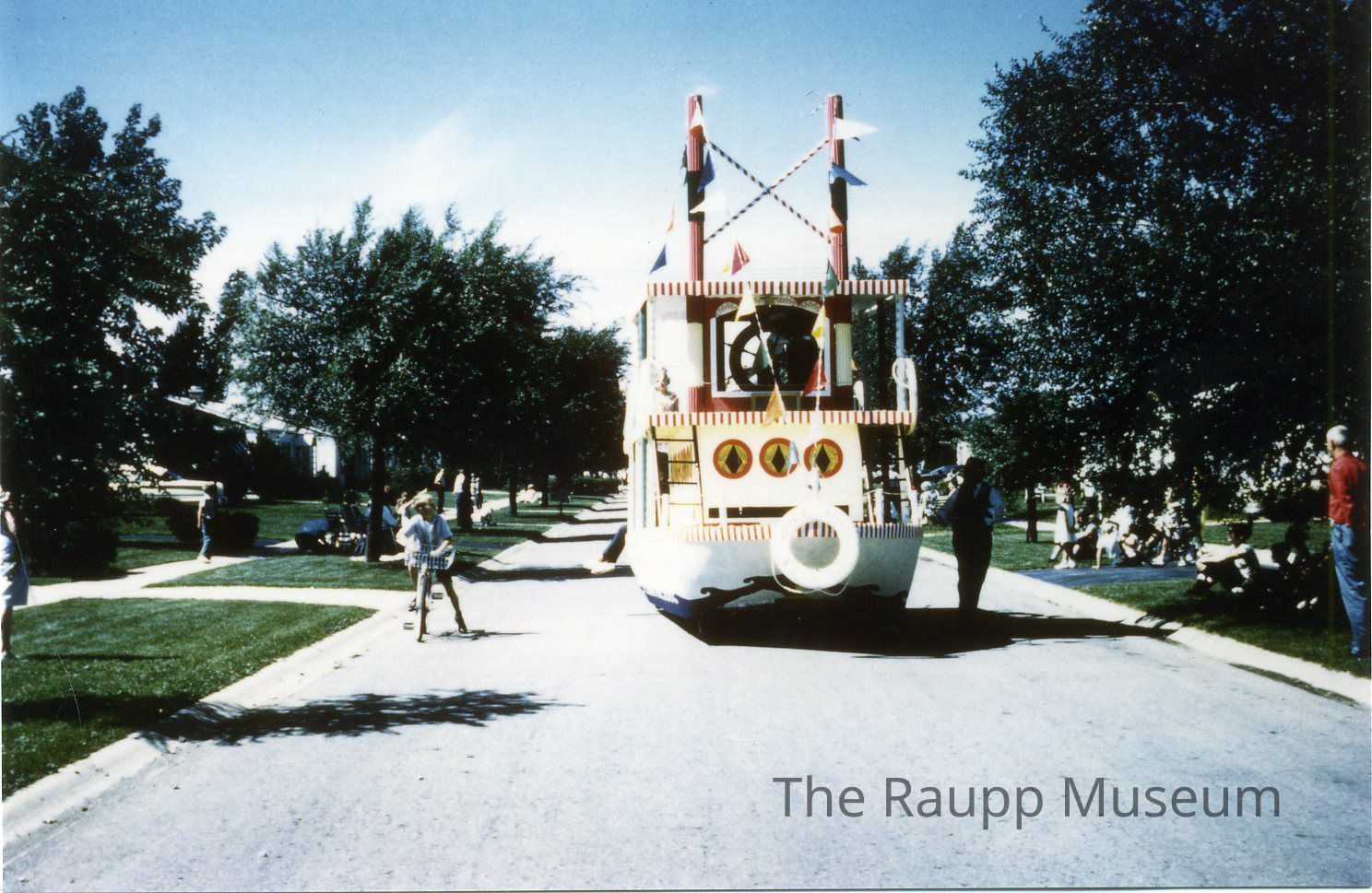 Color photographic print. Image of the Buffalo Grove Days parade. Image of the front of a river boat float. Child riding a bicycle on the left side of the photo. Parade spectators seated on both sides of the street. Man in a red shirt in lower right corner. Image printed on Fujifilm Pictro paper. reverse side text written in black ink: "1966 1st Place Float; Best of Show; BG Days."