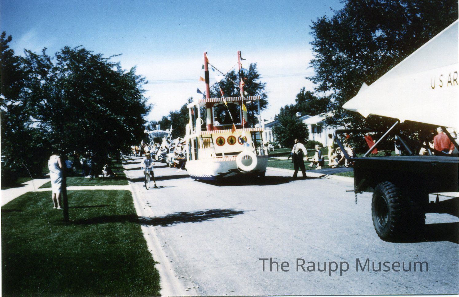 Color photographic print. Image of the Buffalo Grove Days parade. Image of a river boat float following a partial view of a black trailer with a white arrow float on it with text: "US Army." Image printed on Fujifilm Pictro paper. reverse side text written in black ink: "1966 1st Place Float; Best of Show; BG Days."