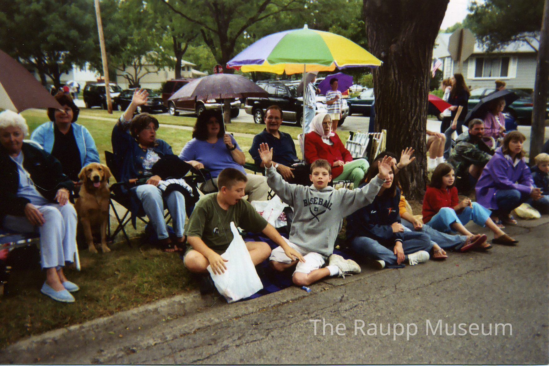 Color photographic print. Image of the Buffalo Grove Days parade children and adult spectators seated in lawn chairs in the grass near the street curb. Boy seated on the curb wearing a gray shirt and waving his arms in the air. Large umbrella with yellow, green and purple pannels near the center of the image. Image printed on DuraLife paper. reverse side marks: "Kodak perfect touch processing Oct/4/03 ID948913 <23A> EGK1