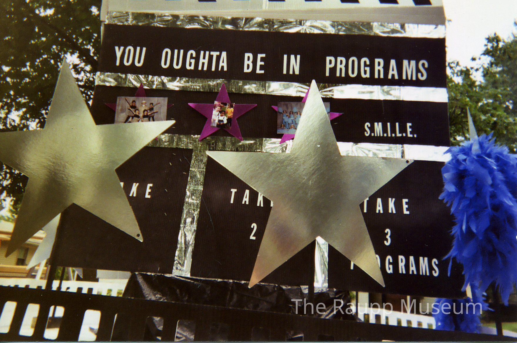Color photographic print. Image of the Buffalo Grove Days parade float. Film themed poster that looks like a clapperboard with markings: “You Oughta Be in Programs." Large silver stars on left and center of image with a blue boa on the far right. Image printed on DuraLife paper. reverse side marks: "Kodak perfect touch processing Oct/4/03 ID948917<00A> EGK1