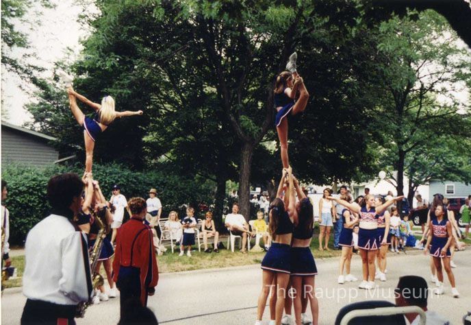 Color print. Image of the Buffalo Grove Days 2002 Parade. Image of Buffalo Grove High School cheerleaders with “Bison” on their tops, two groups of girls have stopped to do lifts with both girls in the air holding one leg in a straight position. Team walking in front of the band and wearing blue and red uniforms. Two band members partially seen in lower left corner carrying instruments and wearing red and blue striped uniforms. All looking away from camera. Man's neck partially obsured by lawn chair in lower right corner. reverse side numbered: <No. 08> 008 13+00 NNNNN+07AU 1065. Printed on Fujifilm paper.Relationships