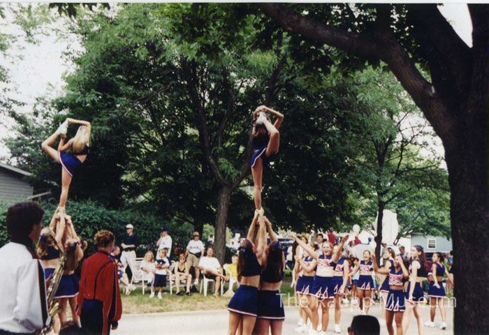 Color print. Image of the Buffalo Grove Days 2002 Parade. Image of Buffalo Grove High School cheerleaders with “Bison” on their tops, two groups of girls have stopped to do lifts with both girls in the air holding one leg in a bent position. Team walking in front of the band and wearing blue and red uniforms. One band member partially seen in lower left corner carrying instrument and wearing red and blue striped uniform. Man's head partially obsured in lower right corner. reverse side numbered: <No. 07> 007 13+00 NNNNN+07AU 1065. Printed on Fujifilm paper.Relationships