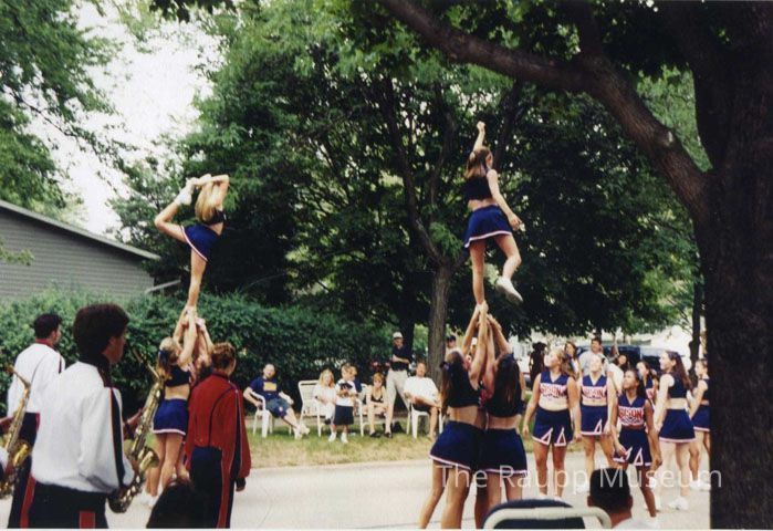 Color print. Image of the Buffalo Grove Days 2002 Parade. Image of Buffalo Grove High School cheerleaders with “Bison” on their tops, two groups of girls have stopped to do lifts. Girl in the air on the left holding one leg in a bent position, one on right has foot elevated. Team walking in front of the band and wearing blue and red uniforms. Two band members partially seen in lower left corner carrying instrument and wearing red and blue striped uniform. Man's head partially obsured in lower right corner. reverse side numbered: <No. 06> 006 13+00 NNNNN+04AU 1065. Printed on Fujifilm paper.Relationships