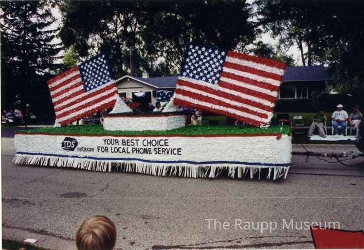 Color print. Image of the Buffalo Grove Days 2002 Parade float.With white base and two stationary American flags on it. Text on side of float: "TDS metrocom Your Best Choice for Local Phone Service." Partial back of child's head in lower left area. reverse side numbered: <No. 15A> 015 13+00 NNNNN+02AU 1067. Printed on Fujifilm paper.Relationships