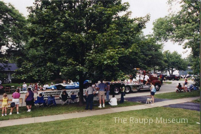 Color print. Image of the Buffalo Grove Days 2002 Parade. Side of a red flatbed truck towing a trailer with a blue and white race car. Side of trailer text: "American Enterprise." Float partially obscured by tree. reverse side numbered: <No. 24A> 024 13+00 NNNNN+00AU 1067. Printed on Fujifilm paper.Relationships