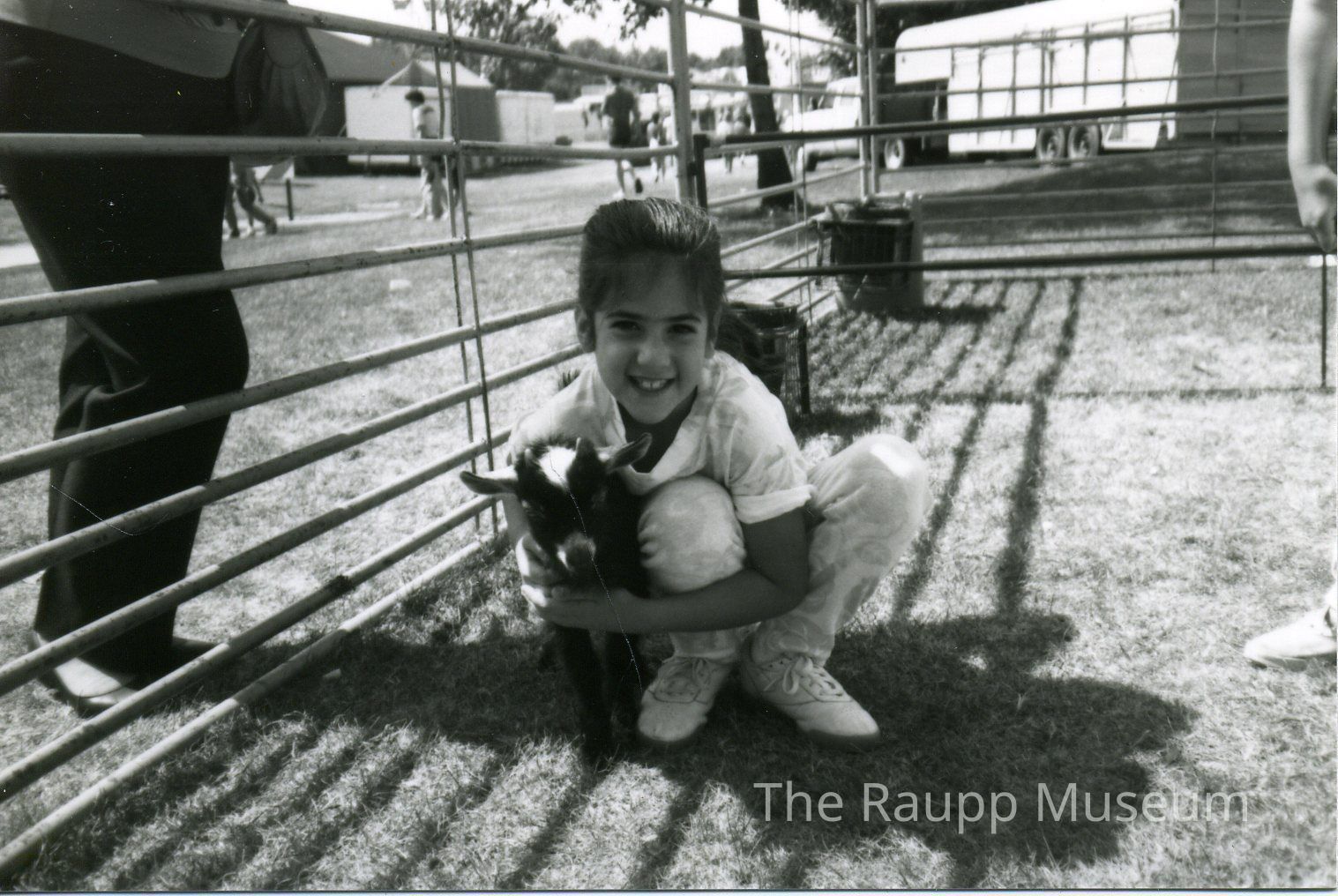 Black and whitephotographic print. Image of a girl hugging a small black goat. Partial image of a woman in background standing on the left behind a fence. reverse side has blue ink marking "Petting zoo- 1986"