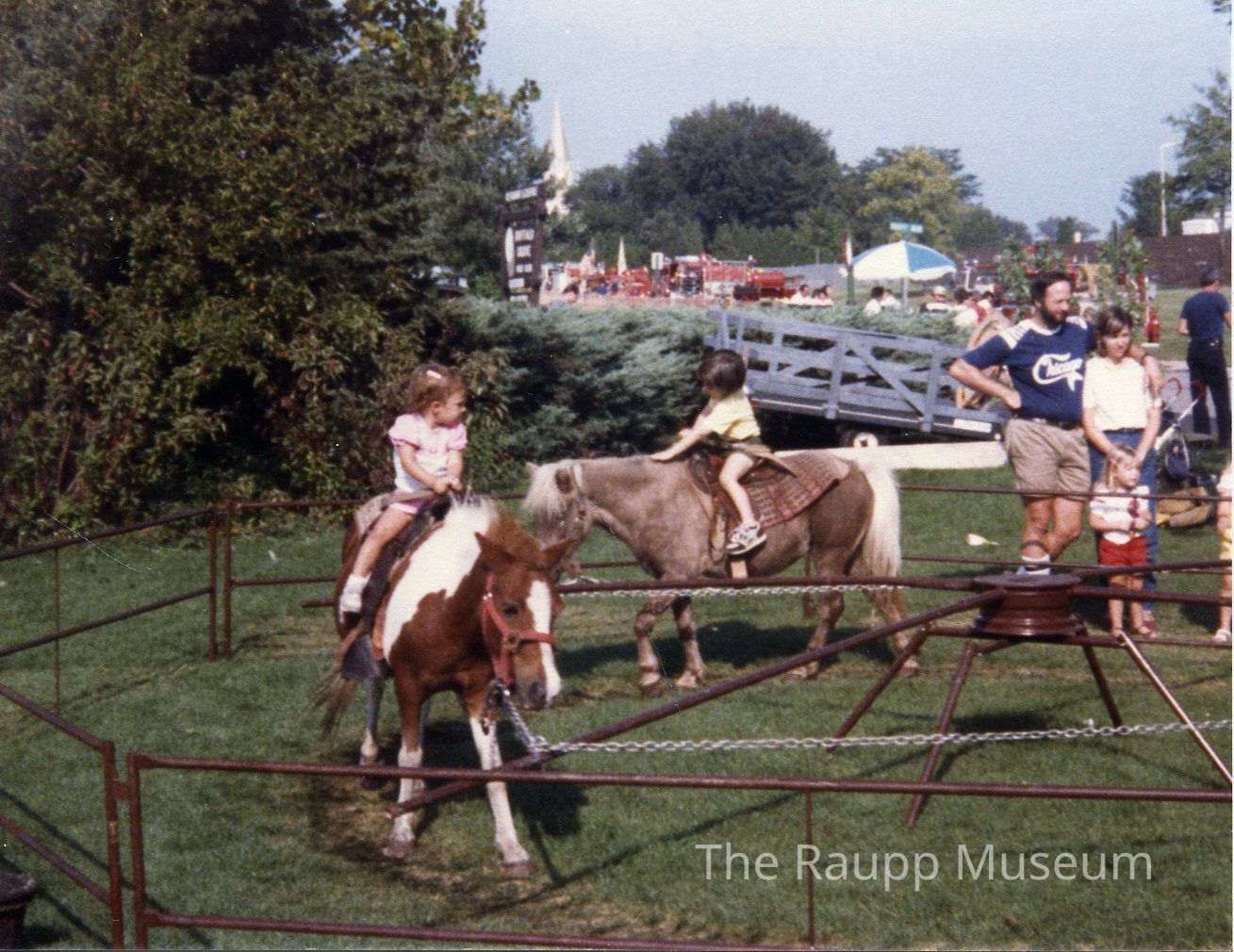 Color photographic print. Image of two children riding ponies chained to a carousel during Buffalo Grove festival days. Man in a blue and white t-shirt standing with a woman and a child in the background. Image printed on Kodak paper. reverse side has blue ink markings "pony rides BG Days 85"