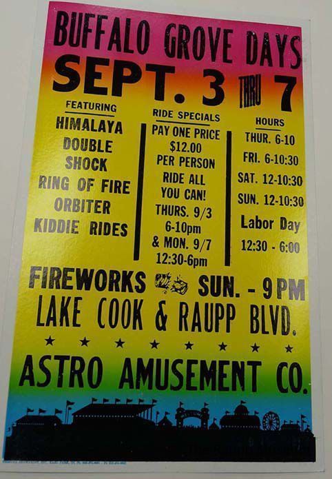 Rainbow colored cardboard advertisement for Buffalo Grove Days 1998. Color blocks from top to bottom are pink, red, yellow, green and blue. Titled: "Buffalo Grove Days Sept. 3 thru 7;" Information arranged in three columns: "Featuring Himalaya, Double, Shock, Ring of Fire, Orbiter, Kiddie Rides; Ride Specials: Pay one price $12.00 per person ride all you can Thurs. 9/3 6-10 PM and Mon 9/7 12:30-6 PM; Hours: Thurs. 6-10, Fri 6-10:30, Sat. 12-10:30, Sun. 12-10:30, Labor Day 12.30-6:00." Horizontal text under: "Fireworks Sun. 9PM/ Lake Cook and Raupp Blvd. ASTRO AMUSEMENT CO."Archive Details