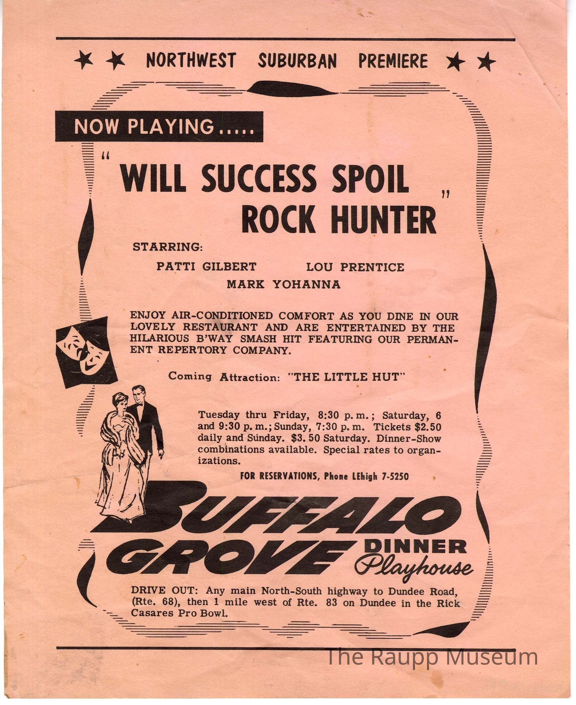 One (1) pink flyer with information about Northwest Suburban Premiere playing the show "Will Success Spoil Rock Hunter" at Buffalo Grove Dinner Playhouse. The flyer includes who the show is starring, what people can expect to enjoy if they make a reservation to see the show including air conditioning, food, and entertainment, and even directions on how to get to Casares Pro Bowl where it takes place.Dimensions