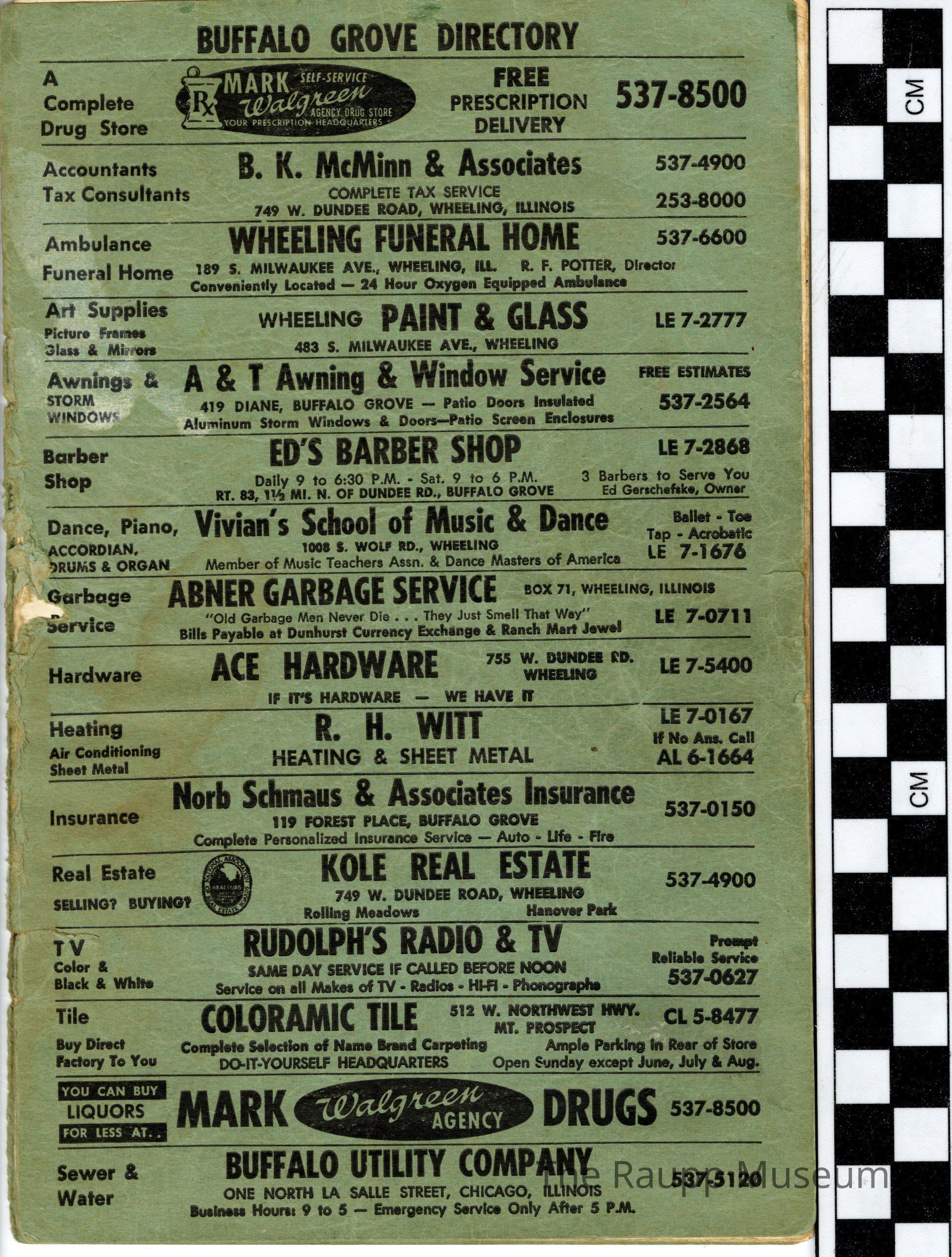 One (1) Village of Buffalo Grove directory, 1968-1969. Front and back cover are green cardboard, with white pages and black text throughout. Front cover has advertisements for local businesses. There are names and numbers handwritten throughout the directory. The back page has a list of names and phone numbers.Archive Details