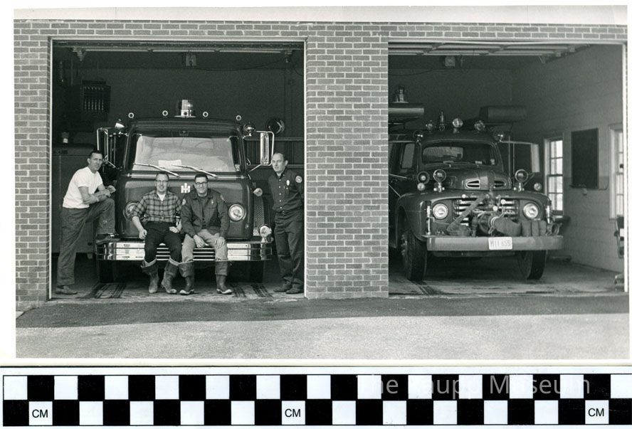 Black and white photographic print. Image of two brick garage doorways with a fire truck parked in each. Four firefighters crowded around the front bumper of the vehicle on the left. Jim Hopkins on far left wearing a white t-shirt has his foot propped on the front bumper. Cliff Bermeister and Wayne Winter are seated in the center on the bumper. Bob Krause is standing on the far right and wearing a long sleeve shirt with a patch on the arm. Fire truck parked in the doorway on the right has license plate number M11 655.