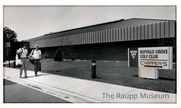 Glossy black and white print with a white border. Image of a long brick building and two men wearing jeans and t-shirts walking on a sidewalk on the left side of the photo. Sign on the far right of the photo: "Buffalo Grove Golf Club, Chipper's Restaurant."Made/Created