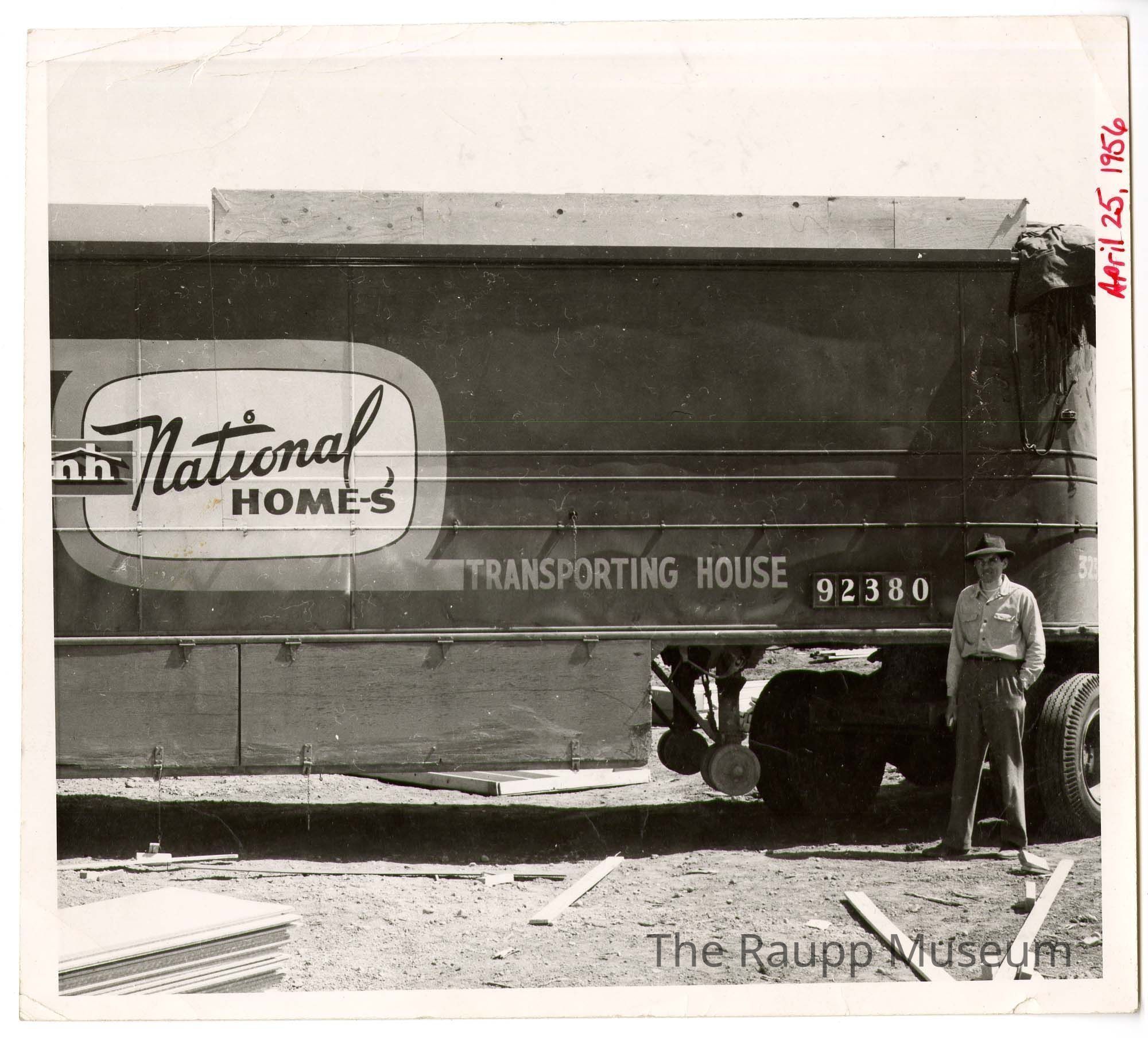 Black and white photograph of Al Frank standing in front of a truck that reads "National Homes Transporting House" with pieces of wood laid out on the ground in front of him. Contained homes materials used for homes on Bernard Drive.Dimensions