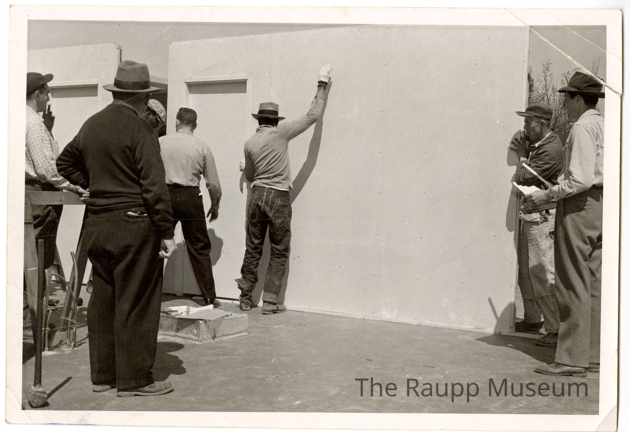 Black and white photograph of Al Frank and other men working to put the walls of a house up. These homes were built off Buffalo Grove Road, Bernard Drive area.Dimensions