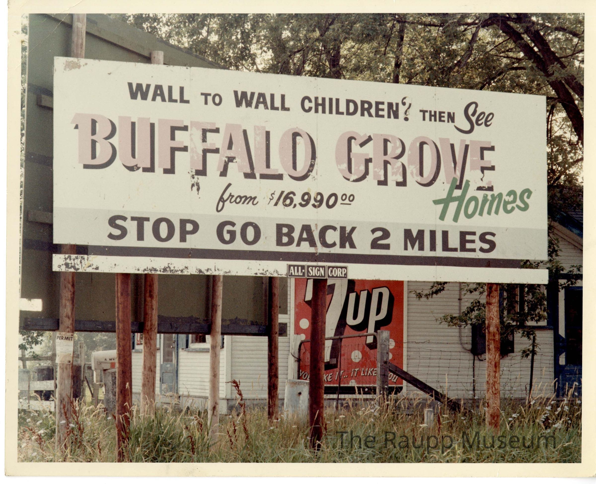A colored photograph of a huge billboard that reads "Wall to Wall Children? Then see Buffalo Grove Homes from $16,990.00 STOP GO BACK 2 MILES" With a 7up Ad right underneath in the background.Relationships