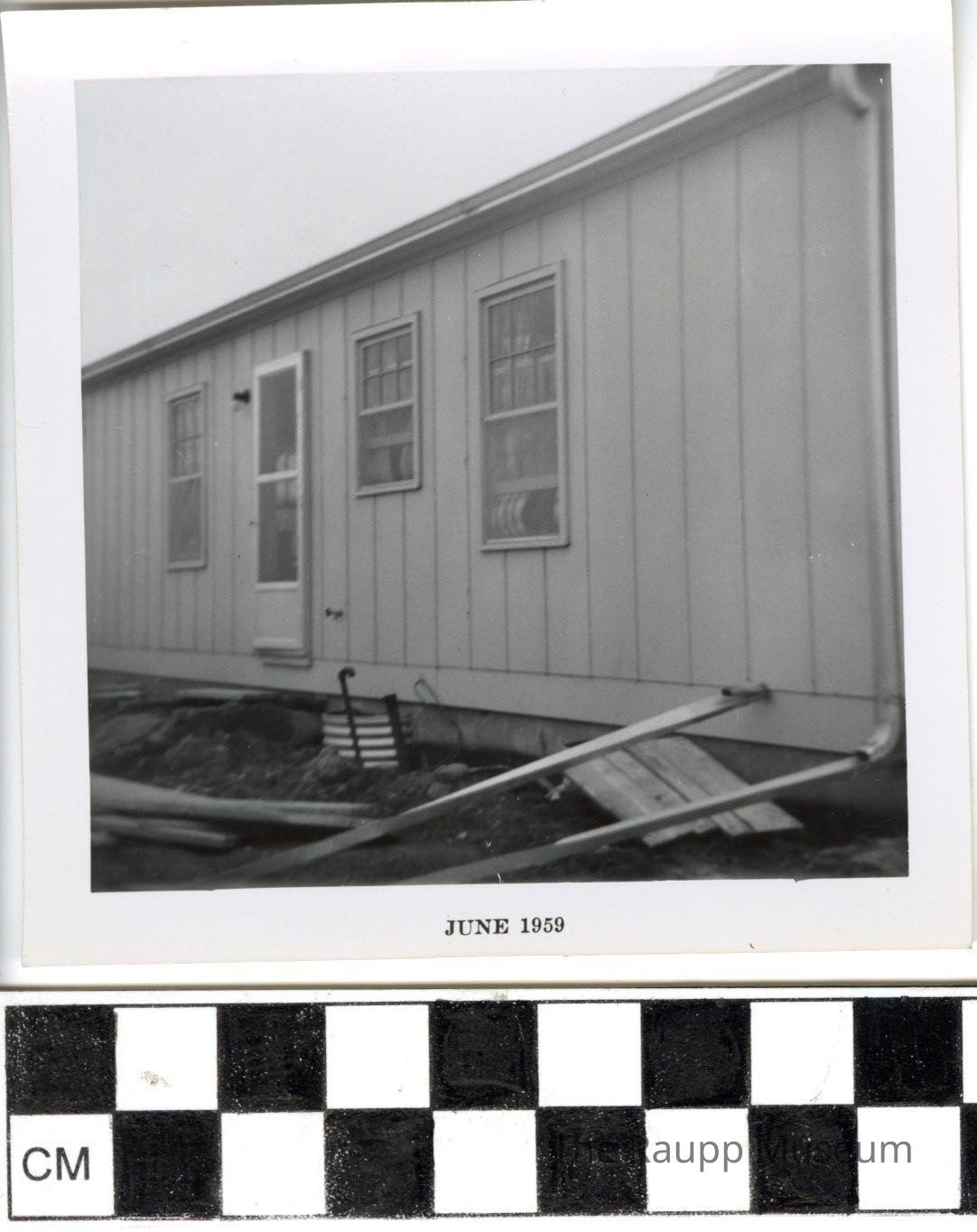 One (1) black and white square photograph of the back of a house with 3 windows and a white door. There are pieces of wood and metal in the yard. There is a white border around the photo. On the bottom front is printed "June 1959". On the back is printed "Kodak Velox Paper" and "797K".Made/Created