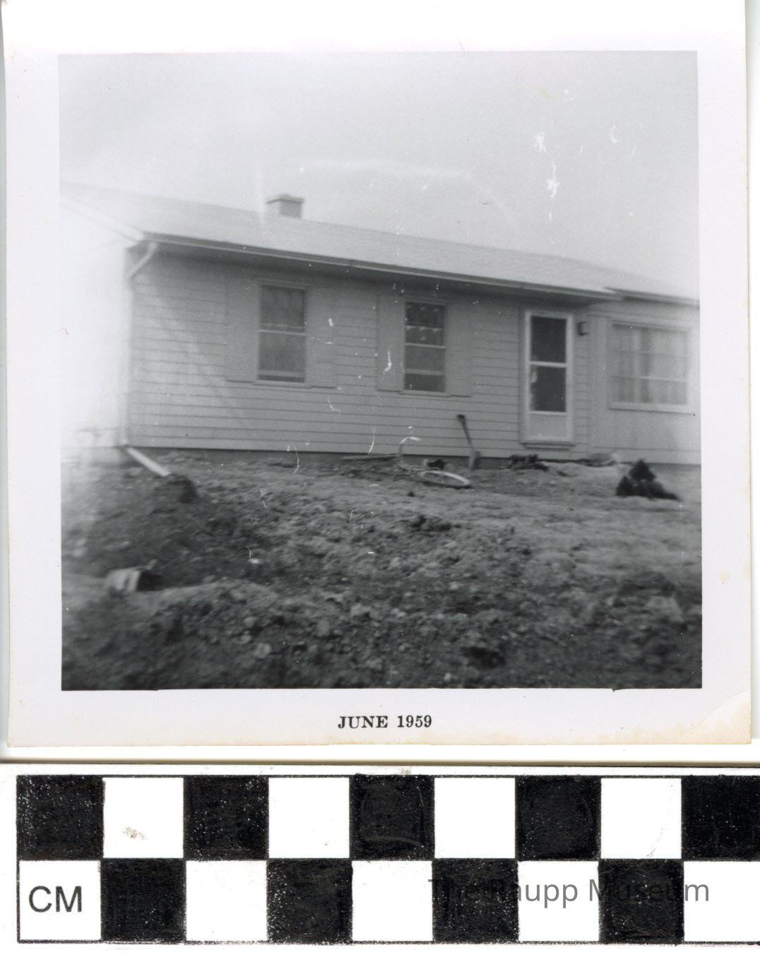 One (1) black and white square photograph of the front of house with unfinished yard. There is a bike on its side next to the door. There is a door and three windows pictured. There is a white border around the photo. On the bottom front is printed "June 1959". On the back is printed "Kodak Velox Paper" and "797K".Made/Created