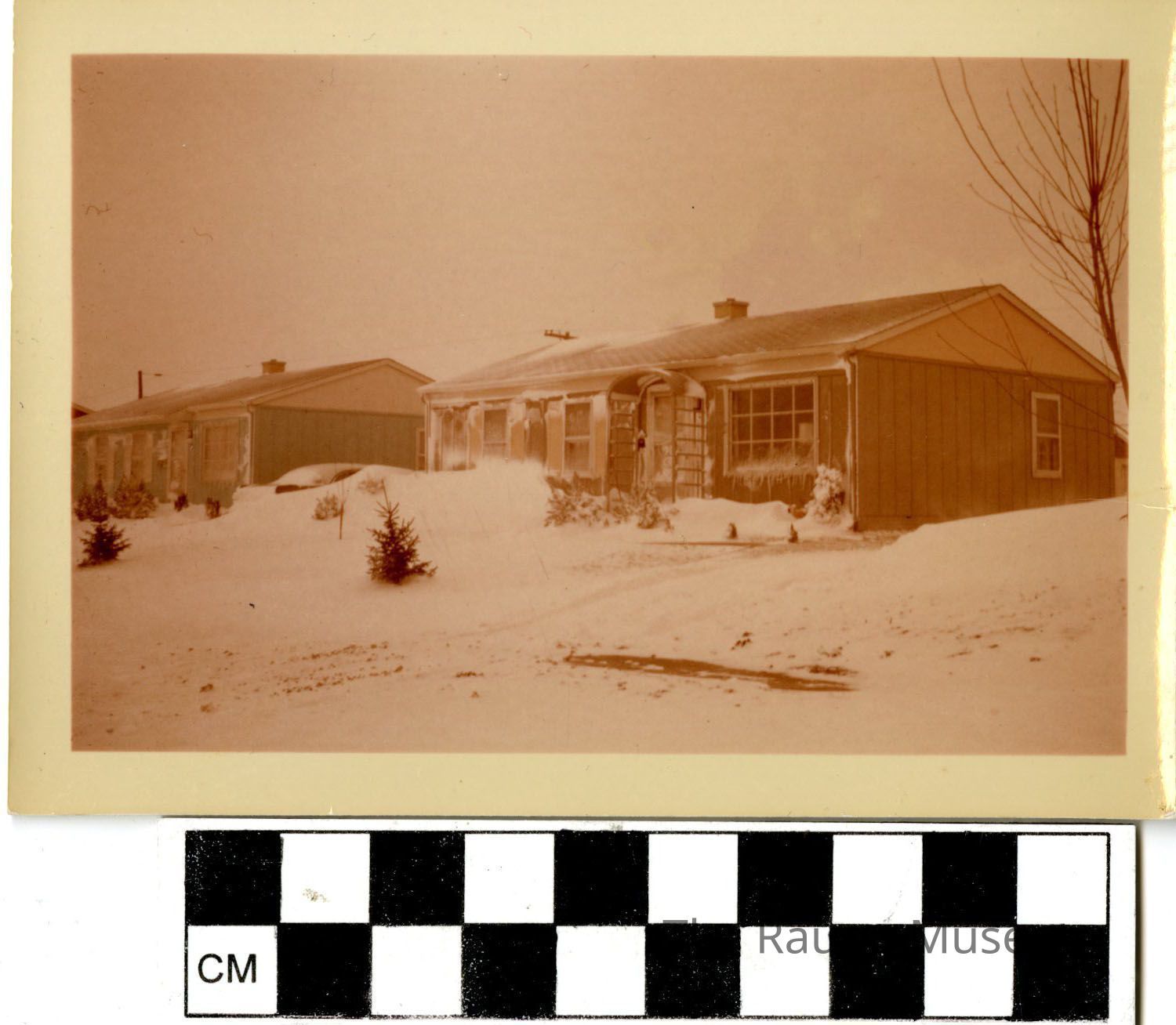 One (1) red toned black and white square photograph of the front of two houses with snow and small evergreens in the yard. One house is green, and one brown. There is a white border around the photo. On the back is printed "EKC" in a circle.Made/Created
