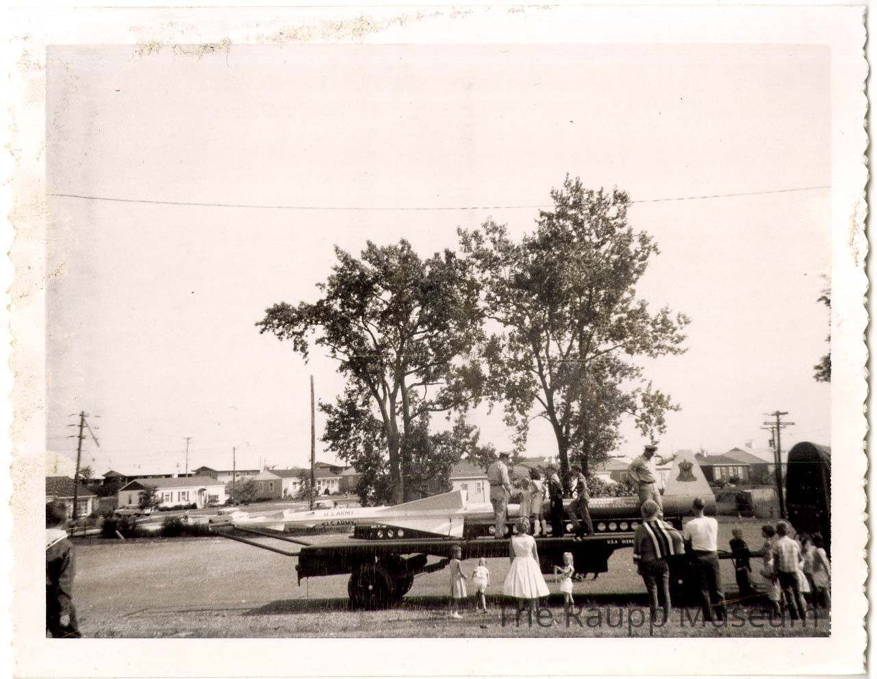 Black and white photograph of a U.S. Army Missile with adults and kids surrounding it looking and interacting with it. There are large trees in the background as well as some single story homes.Dimensions