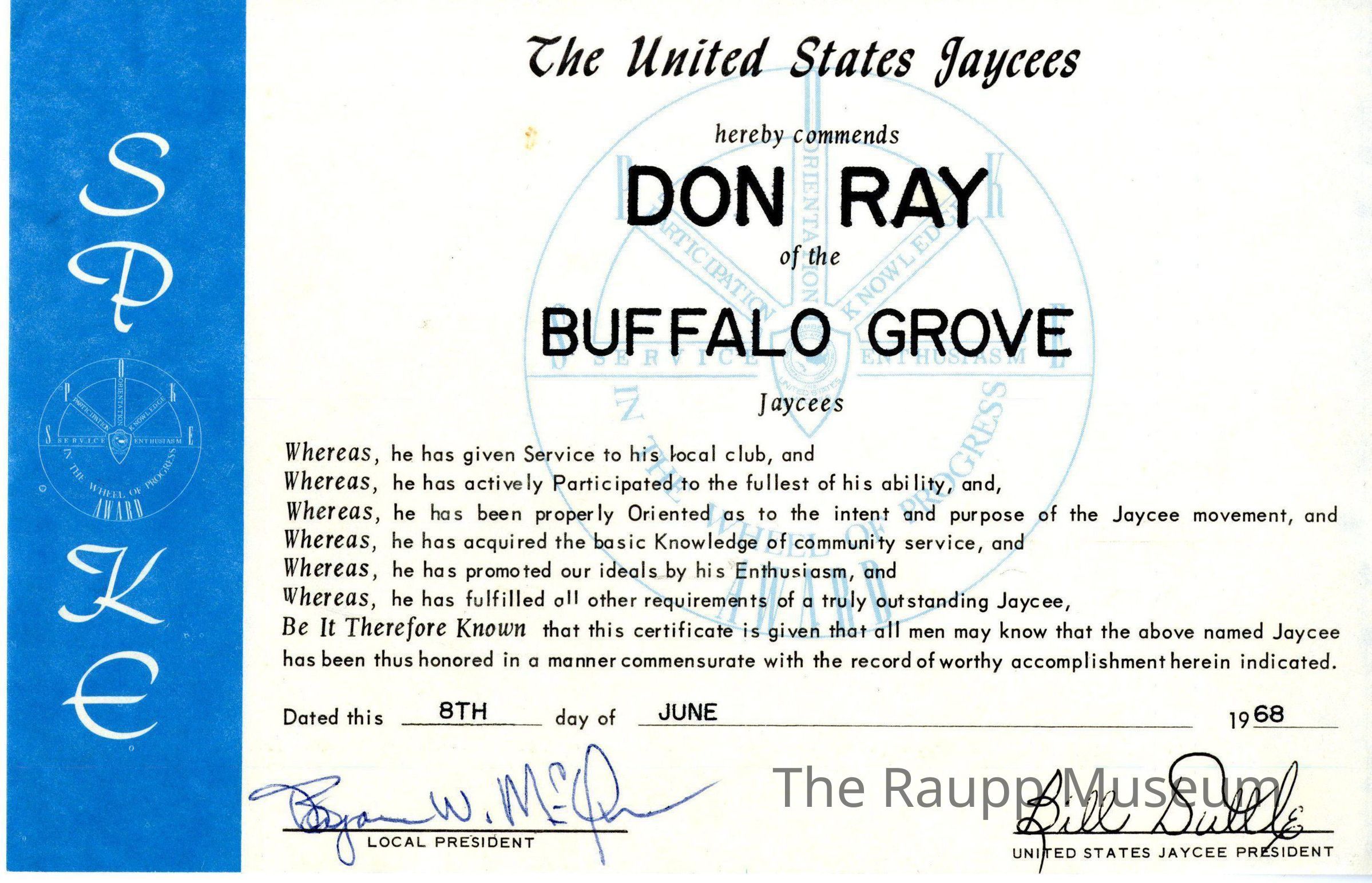 One (1) white and blue paper certificate for Don Ray for his work as a member of the Buffalo Grove Jaycees in 1968. On the left is a blue vertical bar that has "SPOKE" written and in the "O" is "SPOKE AWARD". To the right, and on majority of the page, is black text with statements of accomplishments for Don Ray. It is signed by local president and US Jaycees president on the bottom.Archive Details