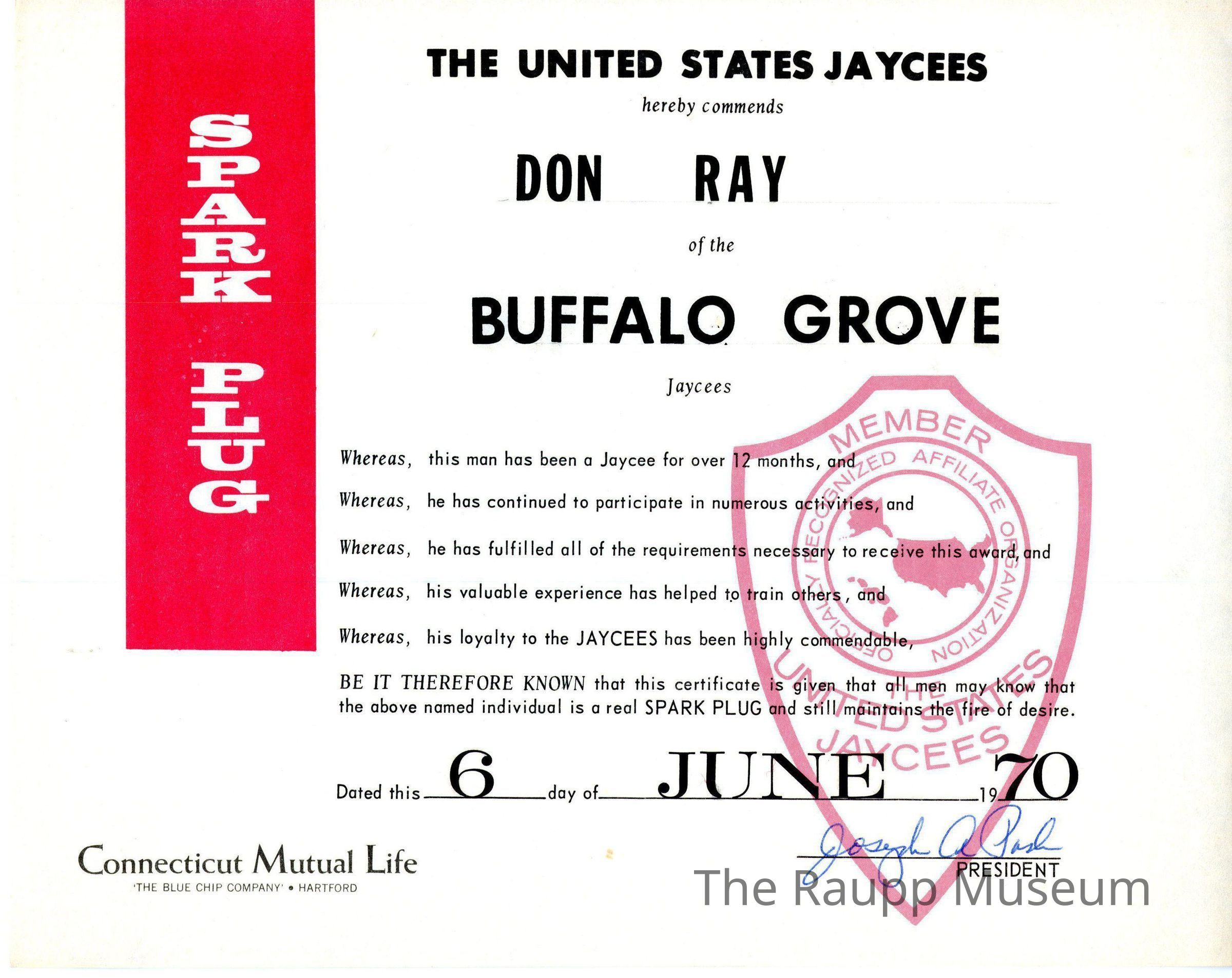 One (1) black, white, and red Spark Plug certificate for Don Ray of the BF Jaycees. Certificate has a red banner on left side, vertical, with "SPARK PLUG" in it. There is a red Jaycees insignia in the bottom right side, with a sponsor logo on bottom left - Connecticut Mutual Life. Certificate dated June 6, 1970, and signed by the President in the bottom right corner.Archive Details