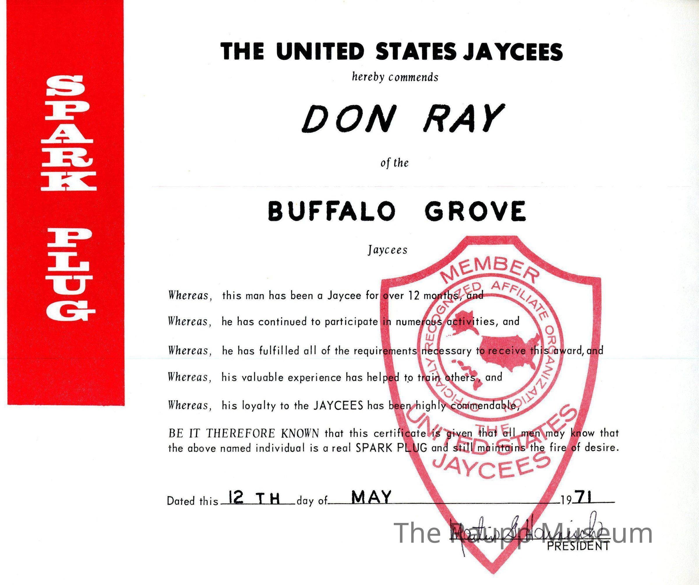 One (1) black, white, and red Spark Plug certificate for Don Ray of the BF Jaycees. Certificate has a red banner on left side, vertical, with "SPARK PLUG" in it. There is a red Jaycees insignia in the bottom right side. Certificate dated May 12, 1971, and signed by the President in the bottom right corner.Archive Details