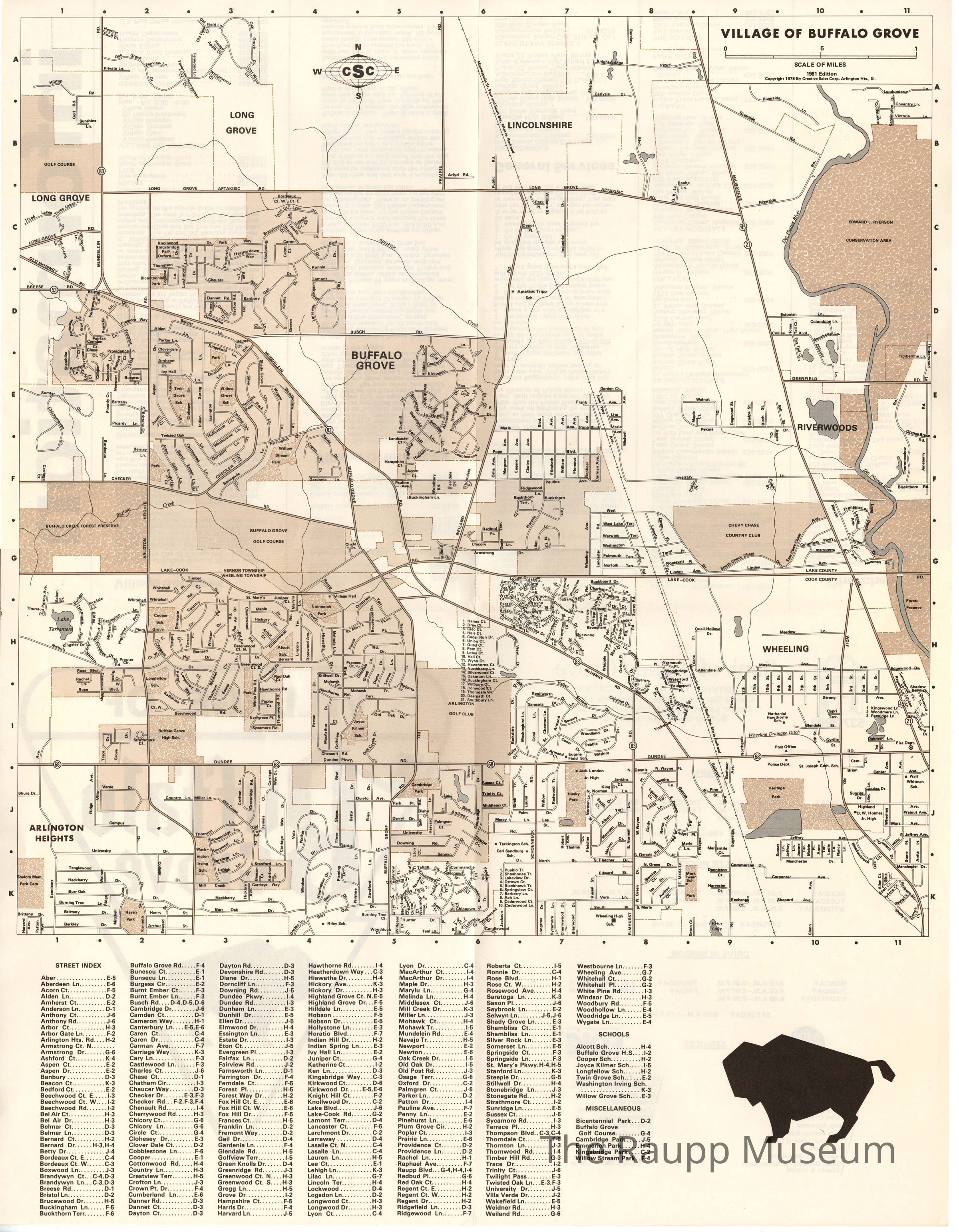 One (1) Village of Buffalo Grove map from 1981. Text is brown and black with white background. The map has lists of roads and their locations. The back has an ad for Bank of Buffalo Grove.