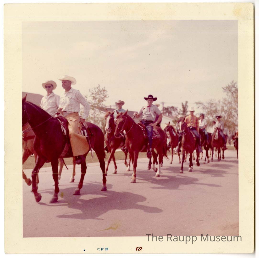A colored polaroid photo of men riding horses down the street in a parade before a steer roast. It is more backed out allowing the viewer to see a line of about 8-10 horses. Taken at first Buffalo Grove Days Parade in 1962.Condition