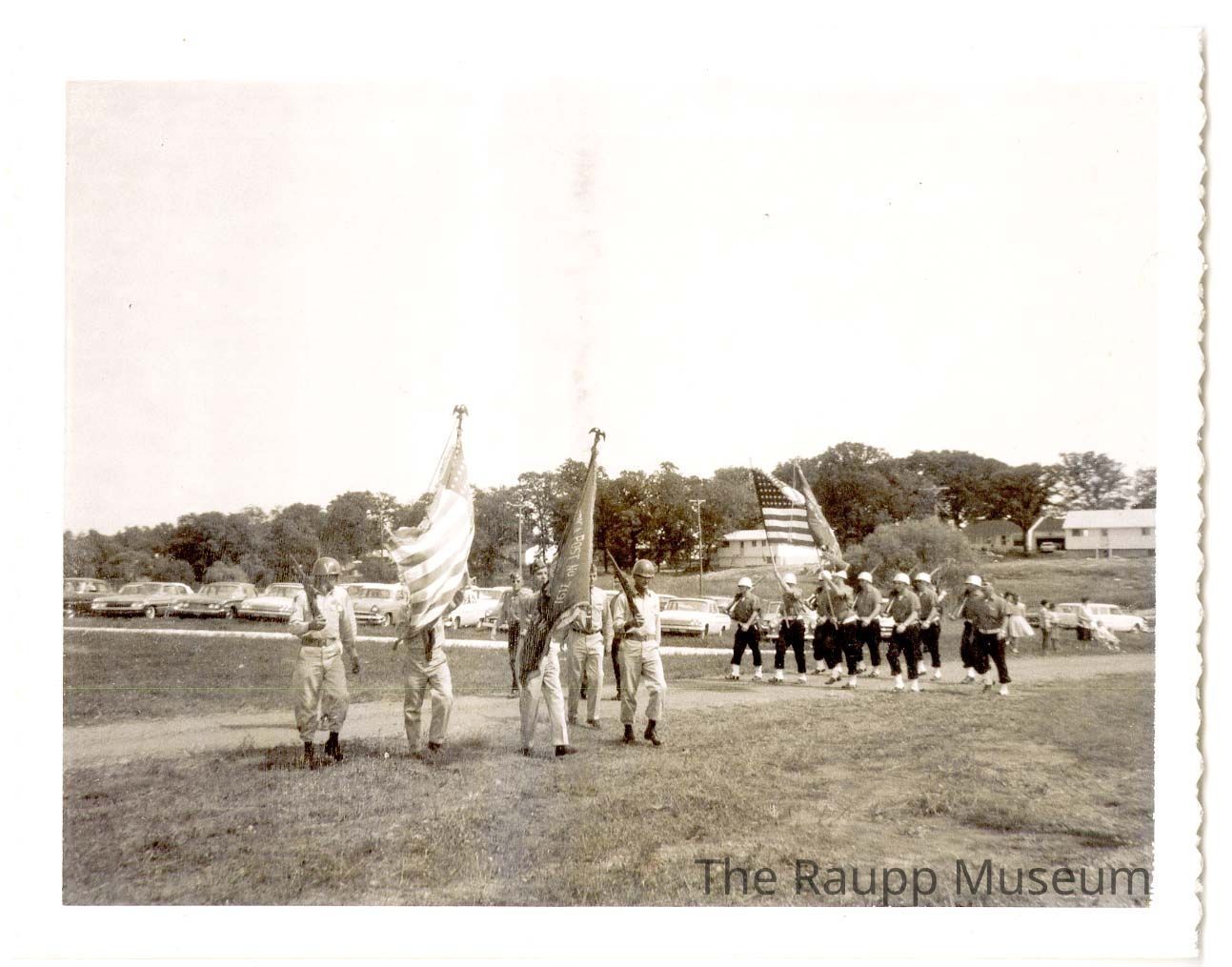 Black and white photograph of two groups of men in different uniforms carrying two flags each. One appears to be representative of their group or military faction, while the other is a U.S. flag. There are cars in the background and trees even further back.Dimensions
