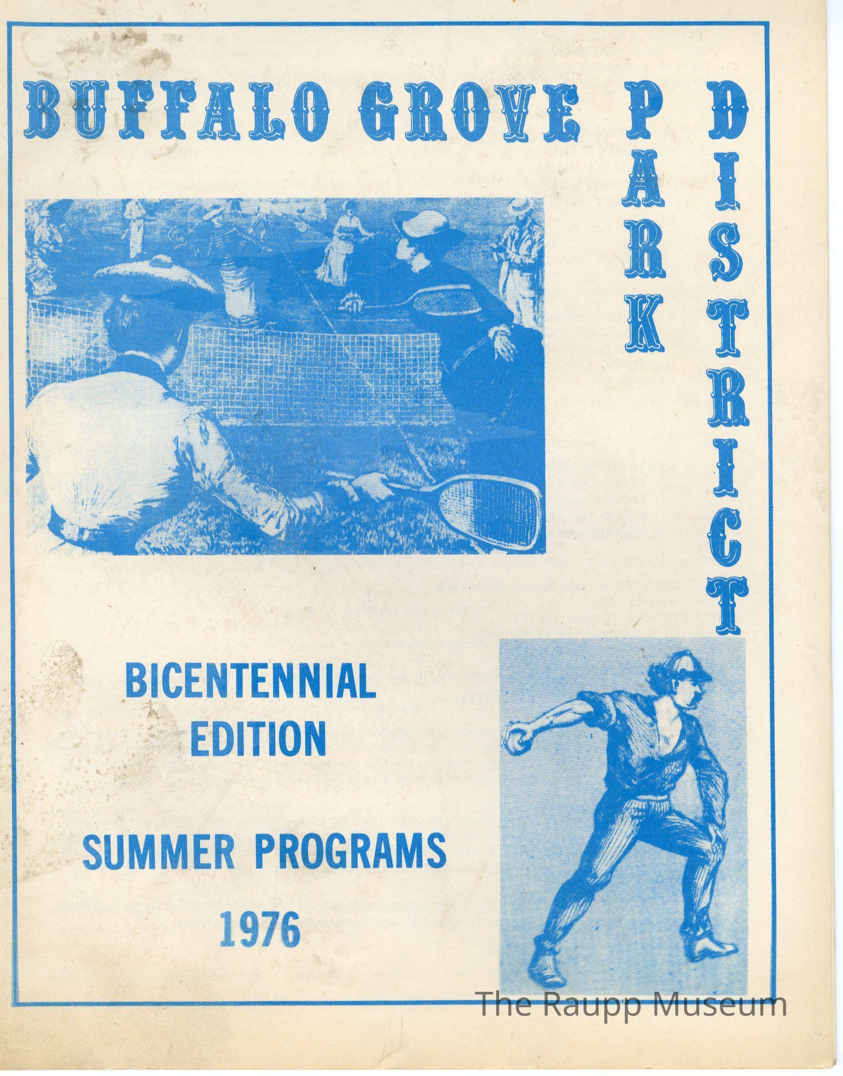 One (1) "Buffalo Grove Park District Bicentennial Edition Summer Programs 1976" brochure booklet. The booklet is white paper with blue typed font . On the cover is a black and white drawing of women playing tennis (colonial style) and a man pitching a baseball underhand. There are 20 pages including the front and back cover. The pages contain program listings and the back cover has a summer pool membership form and mail-in registration form for programs. There are two staples on the left side.