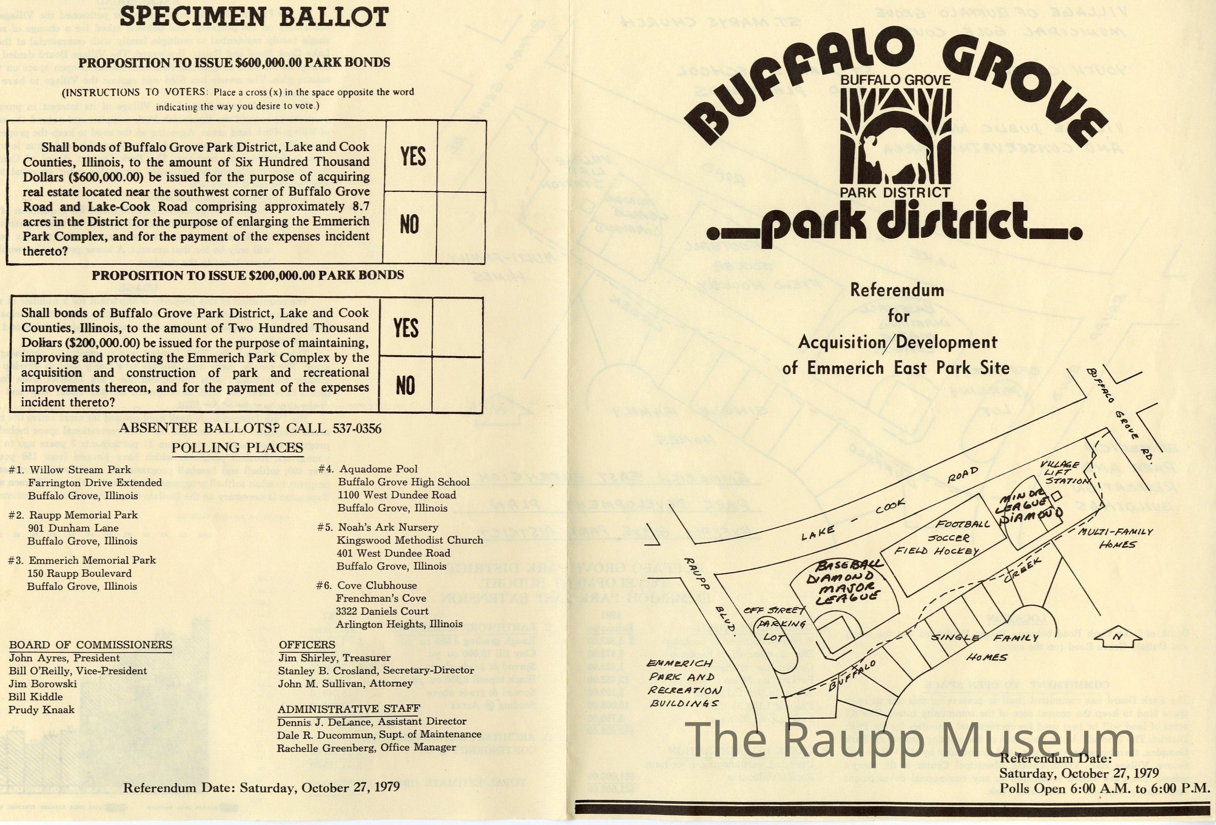 One (1) Referendum informational handout for the Buffalo Grove Park District for "Acquisition/Development of Emmerich East Park Site". The handout is two pages, double-sided, and a lose yellow pamphlet in-between the pages. The handout is yellow with black typed text. On the cover is the above title, the BGPD logo, a drawing of where the park changes would be, and "Referendum Date: Saturday, October 27, 1979, Polls Open 6:00AM to 6:00PM." On the inside is a large hand drawn layout of the Park Development plan, with typed information about cost, location, features, background, and usage. The back of the handout has a Specimen Ballot for two propositions, locations of polling places and staff at the BGPD. The pamphlet included has the cost to taxpayer information and date and time of the voting.