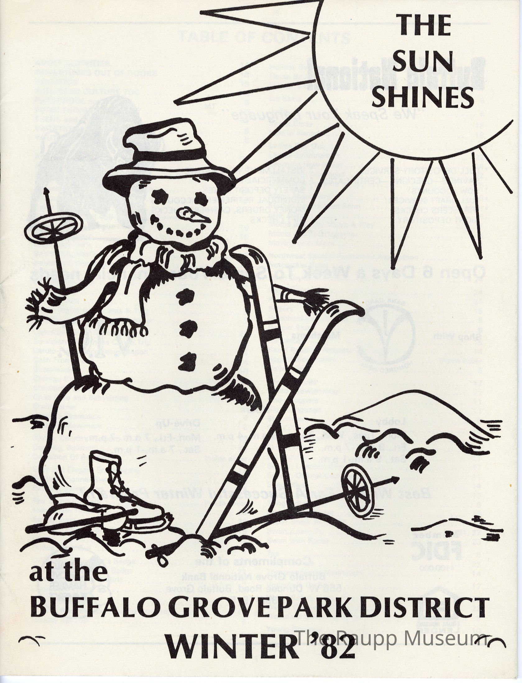 One (1) "Buffalo Grove Park District Winter '82" brochure booklet. The booklet is white paper with black typed font. On the cover is a hand drawn snowman with skis, ice skates, and a sun. Inside the sun it says "The Sun Shines". There are 25 pages, not including the back cover (which has the mailing address information). The pages contain program listings and advertisements from local businesses. There are two staples on the left side.