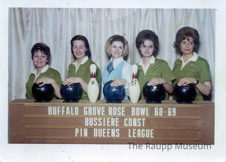 Color print with white border. Image of five lady bowlers, the "Buffalo Grove Pin Queens," stand behind a table with five bowling balls and two pins on the table in front of them. Each bowler has her left hand resting on top of a bowling ball. Four of the women are wearing matching green bowling shirts; one in the center is wearing a blue vest and tie. The table has white text in front: "Buffalo Grove Rose Bowl 68-69/Bussiere Const./Pin Queens League."