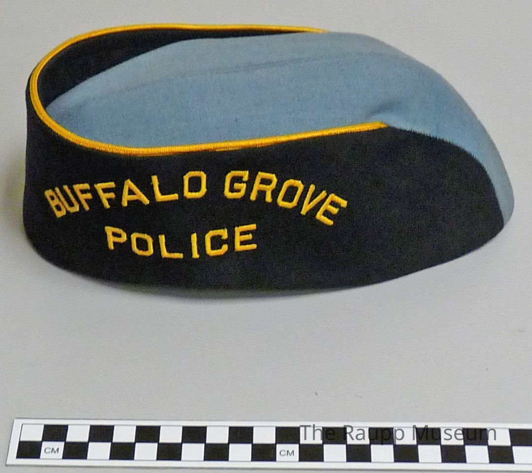 Navy and light denim blue police hat. Oblong shape with two cloth panels: one raised stiff brimmed navy blue panel, and the crown of the hat is denim with a seam running down the middle. Yellow cording on the brim at the top and yellow embroidered text: "Buffalo Grove Police." Interior lining is a pinkish red in color and nylon like sheen to the appearance. Label sewn to the interior hat band indicating size, 6 and 3/4 with a column state lot and price, has not been filled in.Dimensions