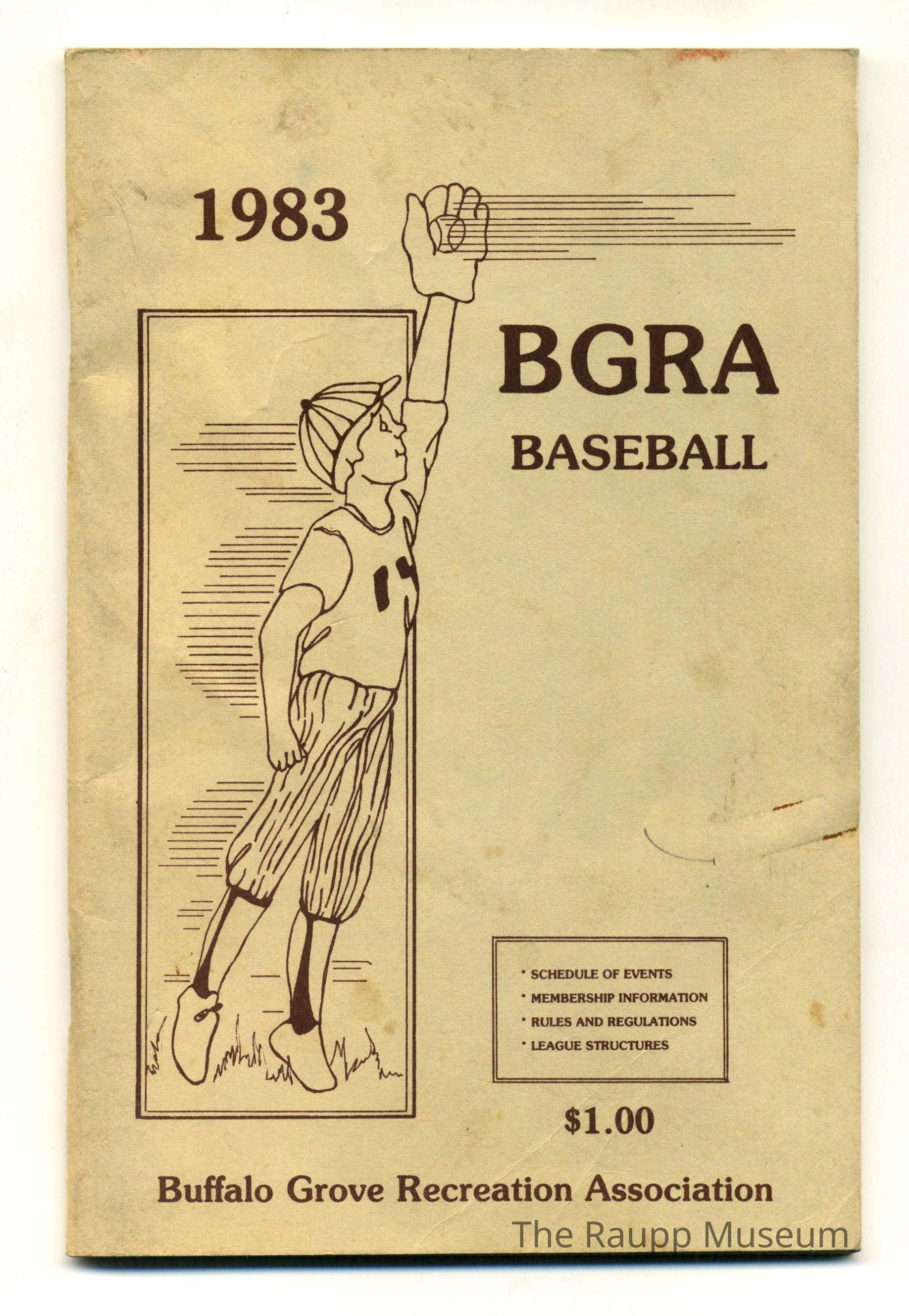 Tan soft cover booklet with vertically creased spine and staple binding. Front has a black and white illustration of a child wearing a baseball uniform catching a ball. "1983" above the illustration, text to the right: "BGRA baseball." Title underneath the illustration: "$1.00 schedule of events; membership information; rules & regulations; league structures; Buffalo Grove Recreation Association." reverse cover contains a hand drawn map of the ball fields.