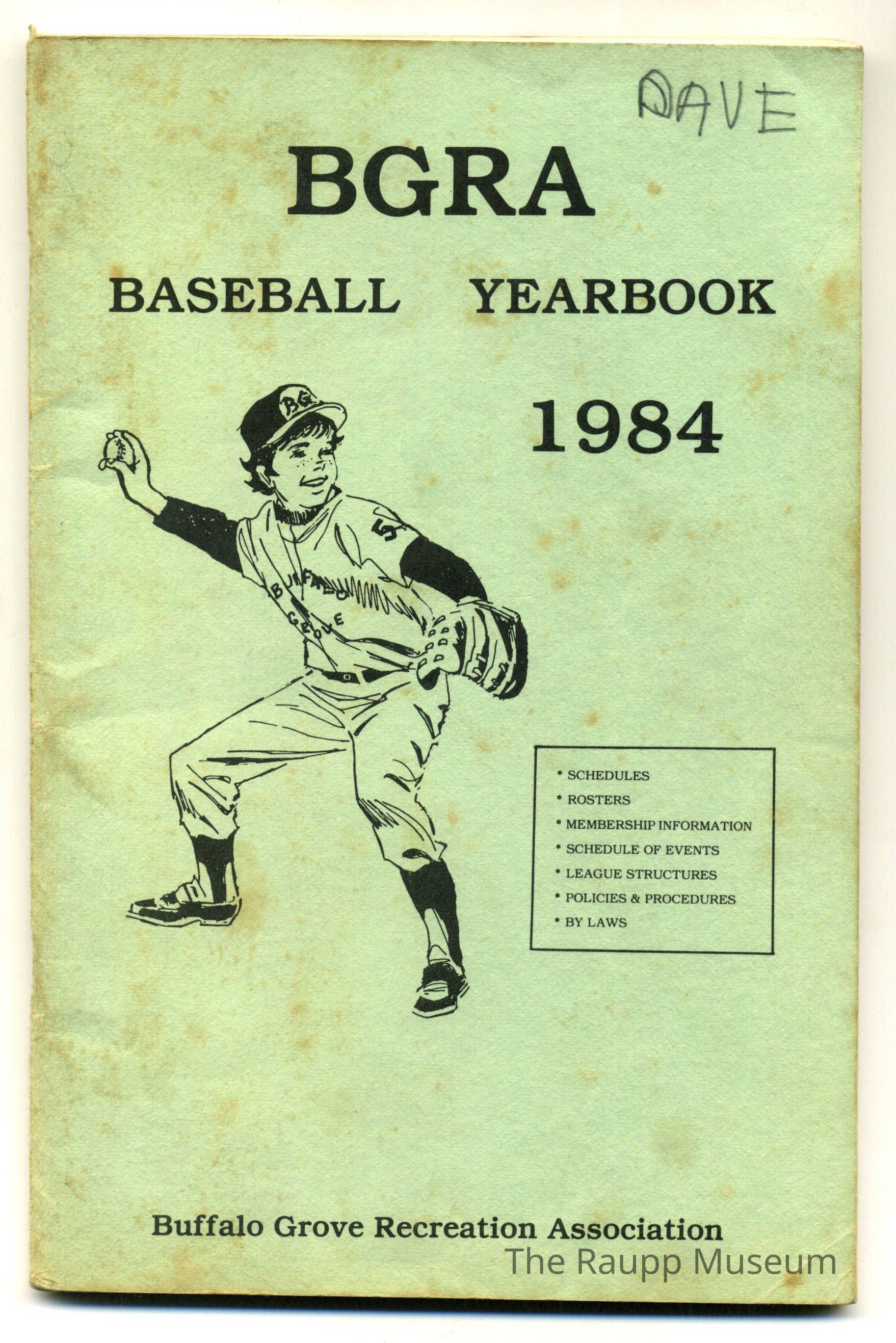 Mint green soft cover booklet with vertically creased spine and staple binding. Front has a black and white illustration of a child wearing a baseball uniform throwing a ball. "Dave" penciled in upper right corner. Other text above the illustration: "BGRA baseball yearbook 1984." Title underneath the illustration: "Schedules; rosters; membership information; league structures; policies & procedures; by laws; Buffalo Grove Recreation Association." reverse cover contains a hand drawn map of the ball fields.