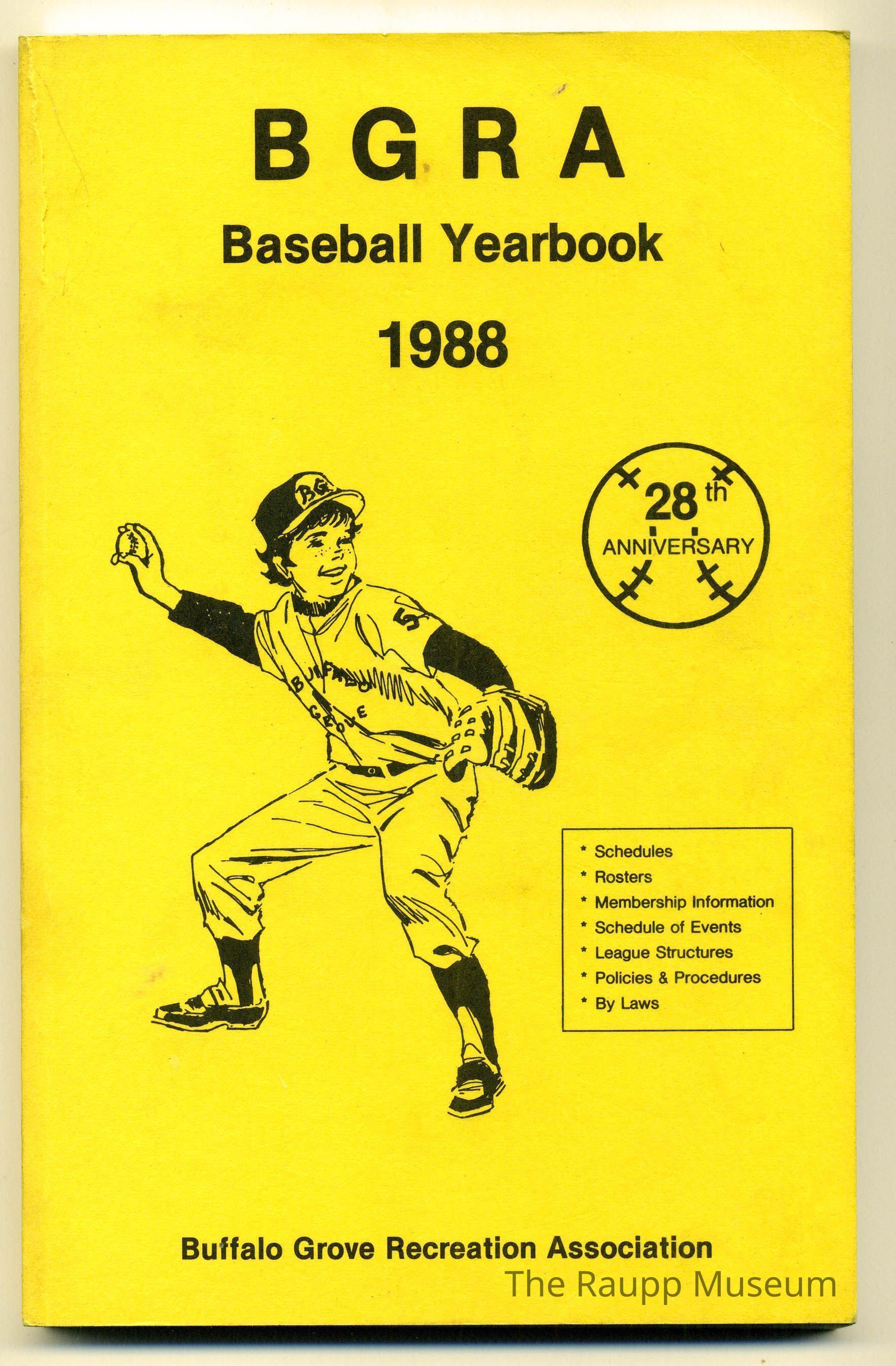 Yellow soft cover booklet with vertically creased spine and glue binding. Front has a black and white illustration of a child wearing a baseball uniform throwing a ball. Text above the illustration: "BGRA baseball yearbook 1988." Title underneath the illustration: "Schedules; rosters; membership information; league structures; policies & procedures; by laws; Buffalo Grove Recreation Association." reverse cover contains a hand drawn map of the ball fields.