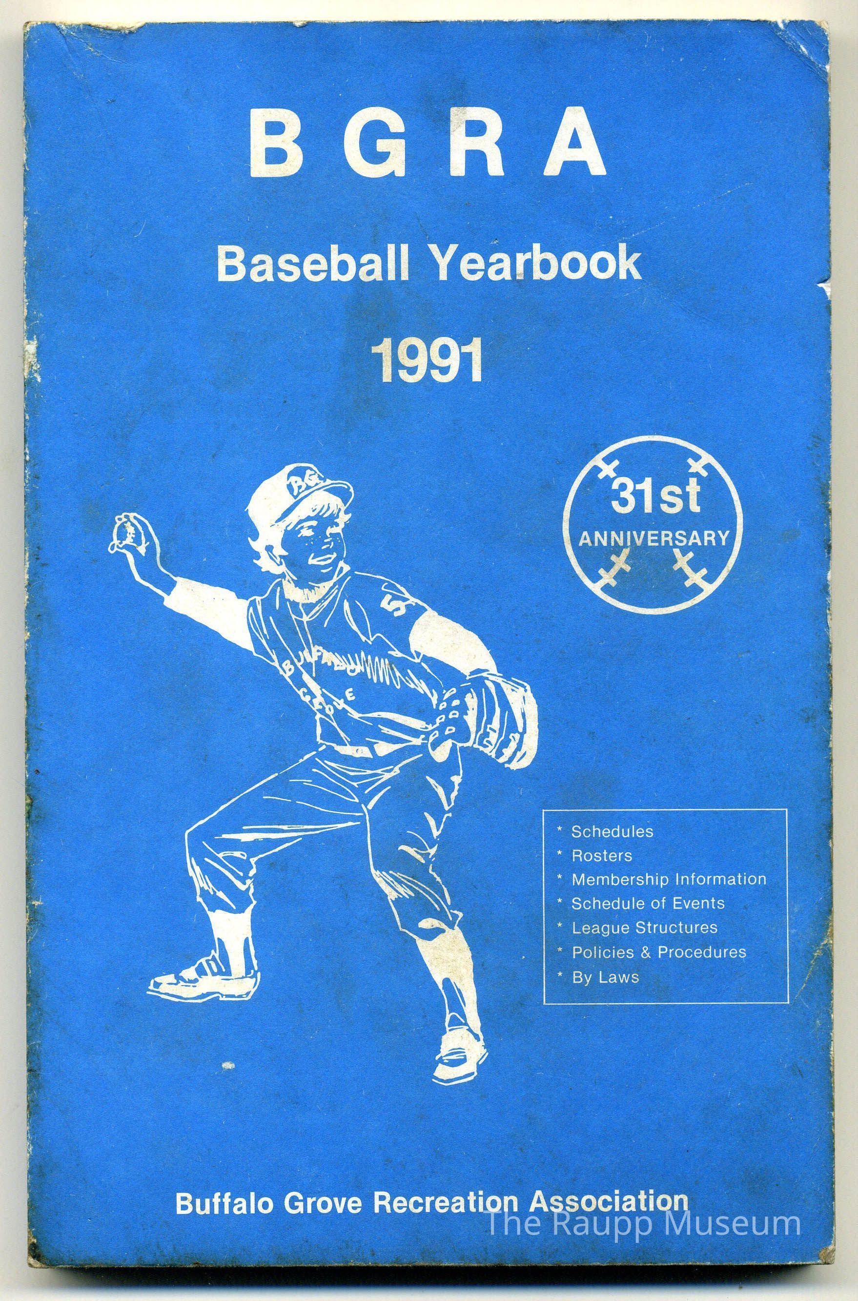 Blue soft cover booklet with vertically creased spine and glue binding. Front has a blue and white illustration of a child wearing a baseball uniform throwing a ball. Text above the illustration: "BGRA baseball yearbook 1991." Title underneath the illustration: "Schedules; rosters; membership information; league structures; policies & procedures; by laws; Buffalo Grove Recreation Association." reverse cover contains white and blue Sega and Nintendo ad from Video Fun Enterprises, Inc. in Deerfield.