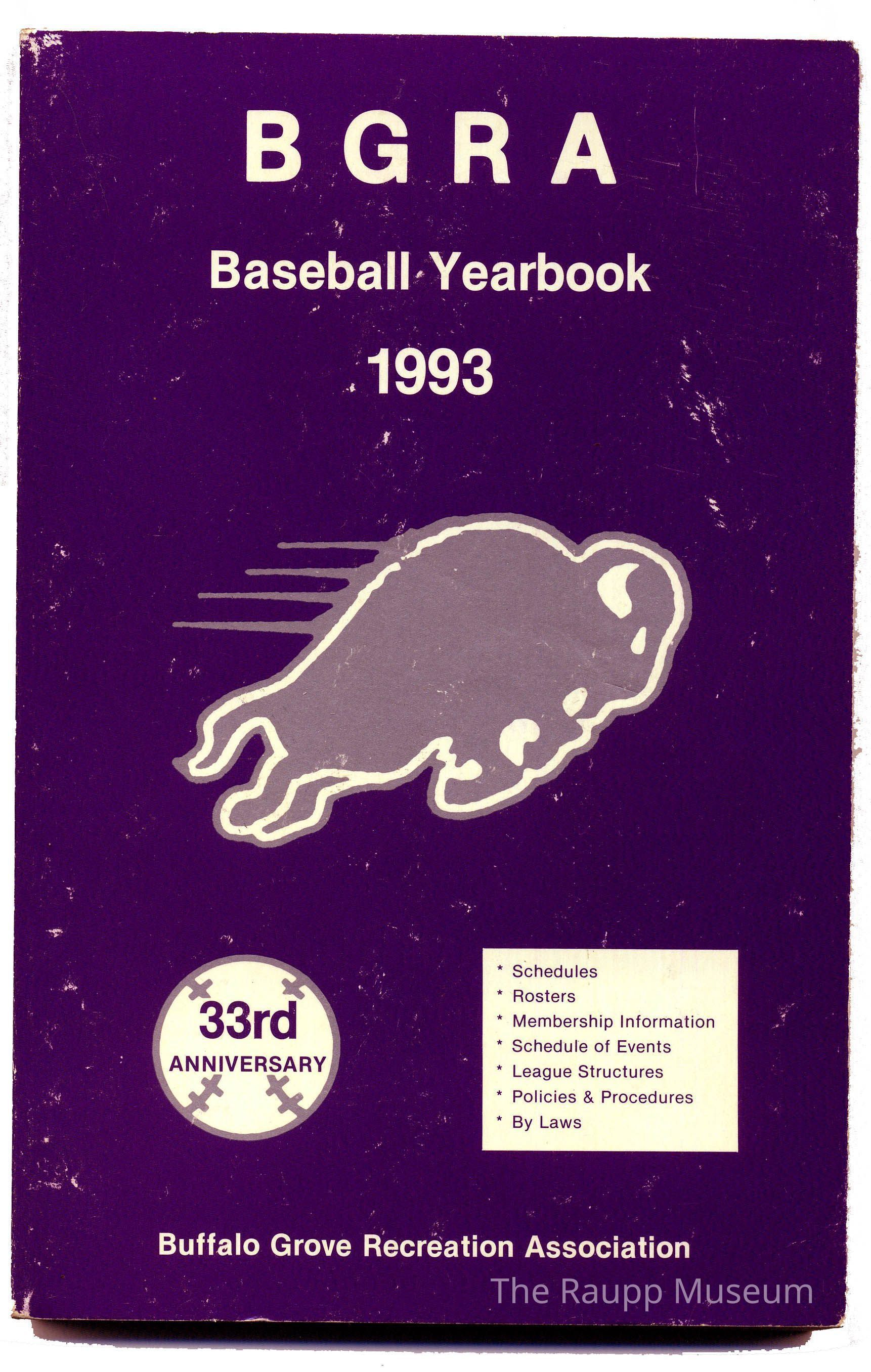 Purple soft cover booklet with vertically creased spine and glue binding. Front has a gray illustration of a buffalo. Text above the illustration: "BGRA baseball yearbook 1993." Title underneath the illustration: "Schedules; rosters; membership information; league structures; policies & procedures; by laws; Buffalo Grove Recreation Association." reverse cover contains an ad for New Age Sports in Buffalo Grove.