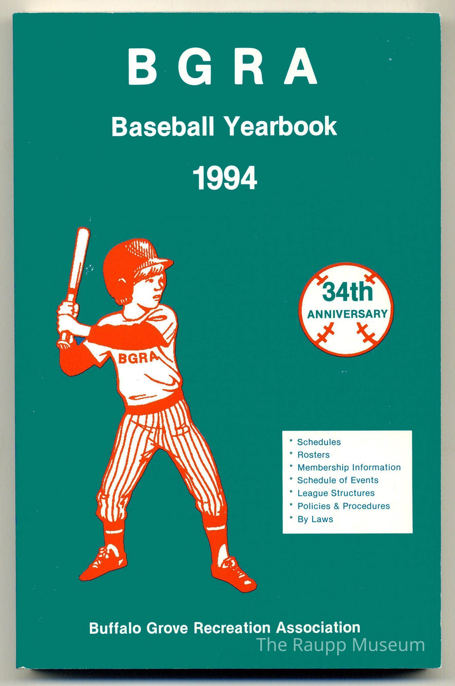 Teal soft cover booklet with vertically creased spine and glue binding. Front has an orange and white illustration of a child wearing a baseball uniform standing in a batting stance. Text above the illustration: "BGRA baseball yearbook 1994." Title underneath the illustration: "Schedules; rosters; membership information; league structures; policies & procedures; by laws; Buffalo Grove Recreation Association." reverse cover contains a white and orange ad for New Age Sports in Buffalo Grove.