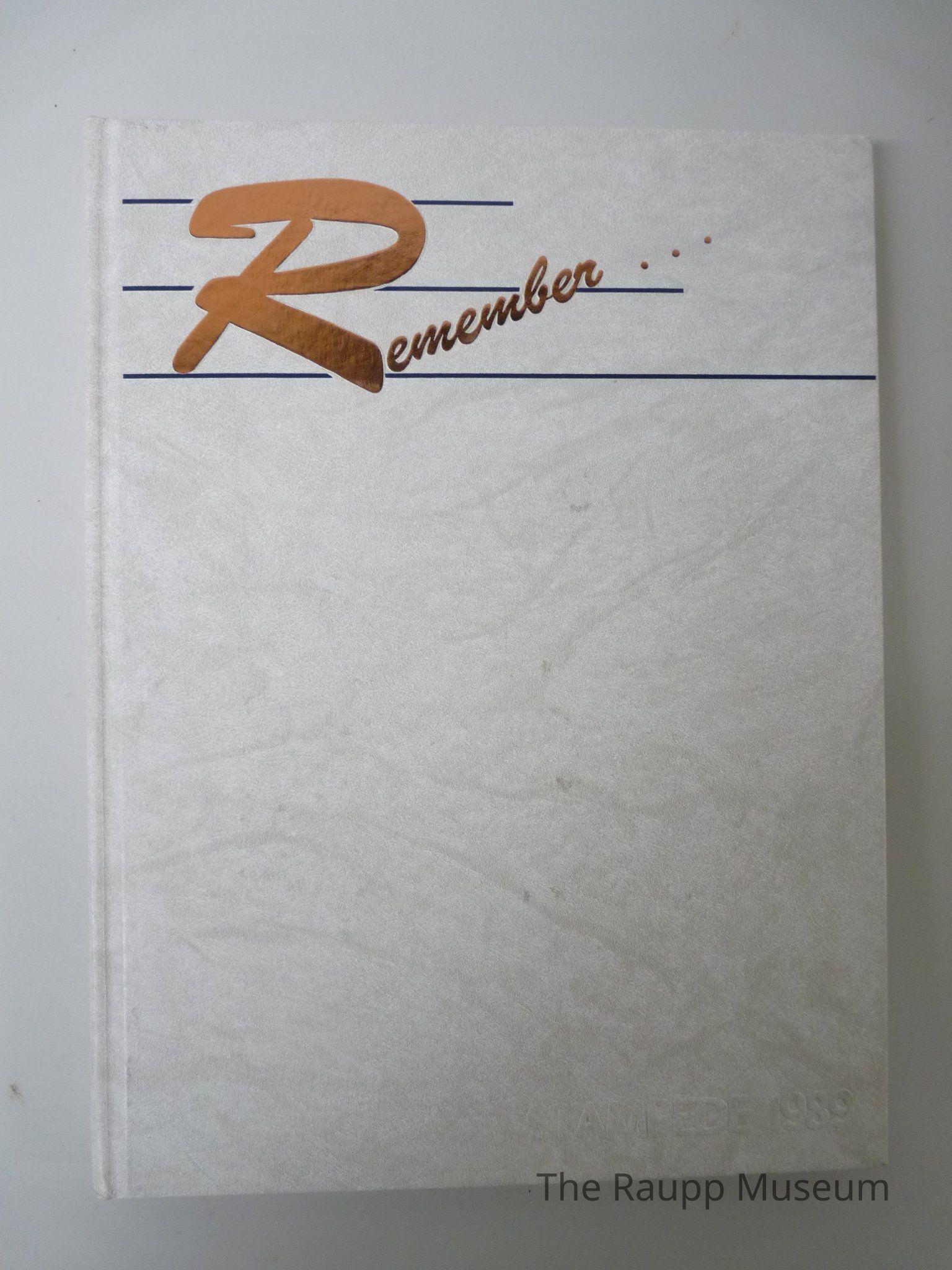 One (1) Buffalo Grove stampede color yearbook from 1989. Contains photographs and text. The hardcover is a white marble look with "Remember..." in gold glossy lettering along top, with three evenly spaced blue lines behind it. Embossed on the bottom right corner, in the same white marble color, is "Stampede 1989". 232 total pages.