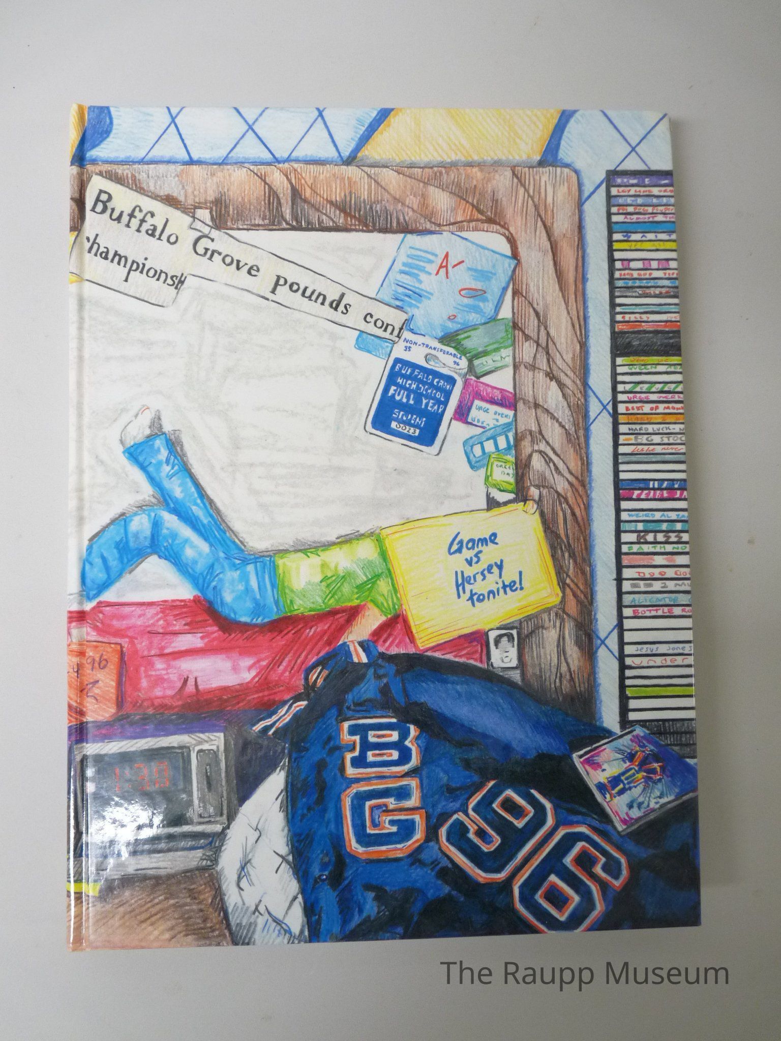 One (1) Buffalo Grove stampede color yearbook from 1996. Contains photographs and text, with 223 pages. The hardcovers is decorated in hard-drawn glossy picture of a bedroom from above, with bed, CDS, BG letterman jacket, and clock, books. It extends on the front and back of book. Contains color, with primarily black and white photos.