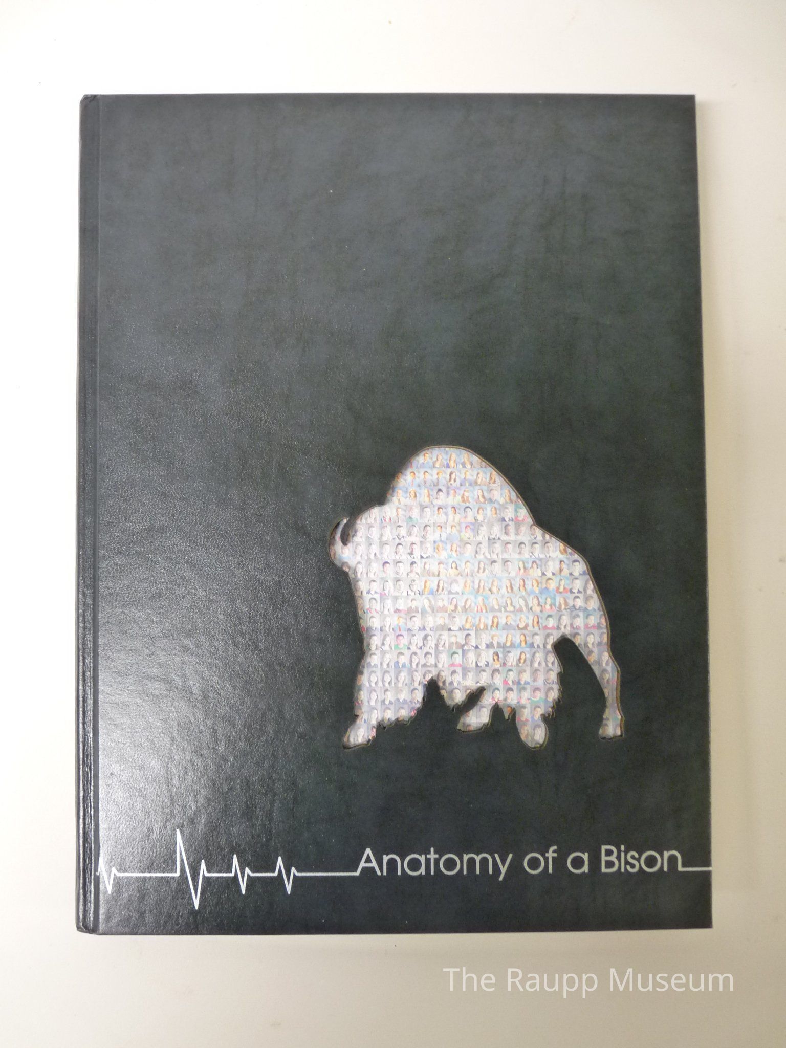 One (1) Buffalo Grove stampede color yearbook from 2008. Contains photographs and text. The title on the cover is "Anatomy of a Bison". THe hardcover is black with a cut out of a bison on the bottom right and the title in grey ink on bottom right with zig-zag lines. Inside the cut out is a collection of small color photogrpahs of students (portraits photos). Contains over 217 pages (end pages not numbered).
