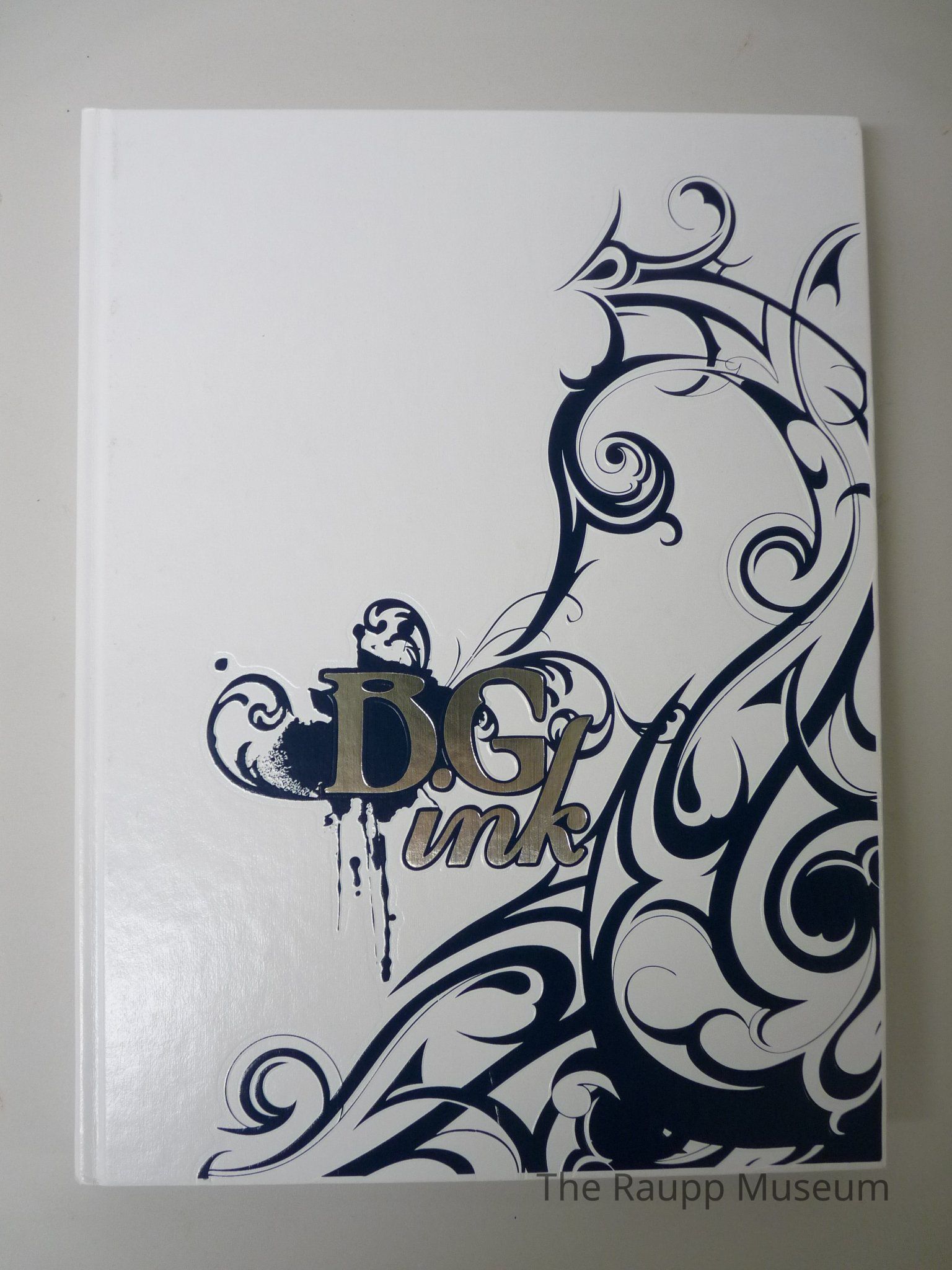 One (1) Buffalo Grove stampede color yearbook. Contains photographs and text. The hardcover is white with blue decorative lines on the right side and toward the center. In the middle is a glossy silver text "B.G ink". There are 224 pages with color and black and white photos.
